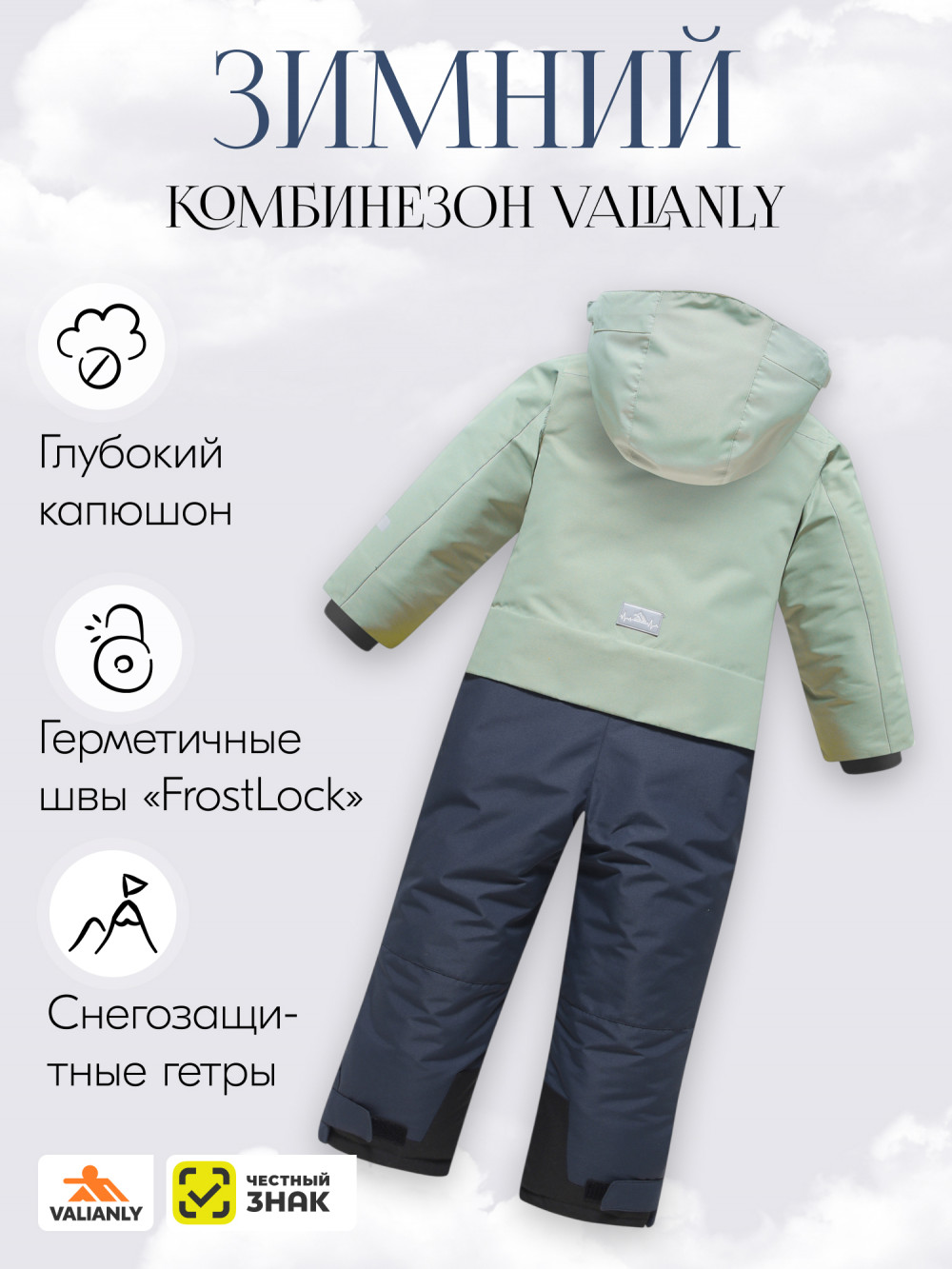 Материал комбинезона обладает высокой водонепроницаемостью, что гарантирует защиту от мокрого снега и неожиданных осадков. Этот комбинезон — ваш идеальный выбор для активного отдыха, обеспечивая тепло, уют и защиту в любых зимних условиях.
