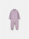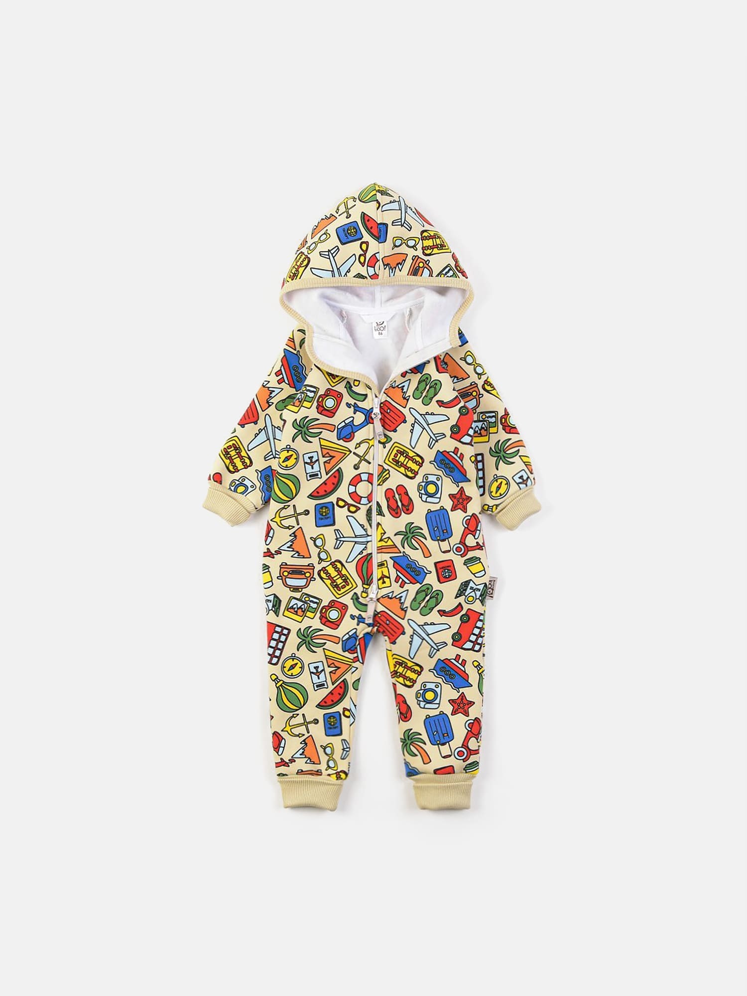 Комбинезон с капюшоном из плотного хлопкового трикотажа с начёсом на изнаночной стороне. Глубокий капюшон и воротник-стойка надежно прикрывают шею и голову. Центральная застежка на молнию дополнена защитной планкой от прищемлений по всей длине и в области подбородка. Удлиненные манжеты на рукавах и штанинах "растут" вместе с ребенком. Благодаря специальному крою, комбинезон не сковывает движения ребенка, а резиночка на спине гарантирует идеальную посадку на любой фигуре. Клапан для удобства туалета.