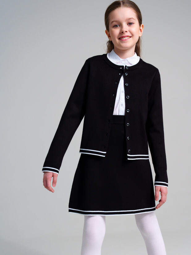 Элегантный трикотажный кардиган с застёжкой на пуговицы имеет прямой крой, подходит для многослойных образов и отлично сочетается с рубашками, блузками и водолазками. Классическая детская юбка трапециевидного силуэта на мягкой эластичной резинке для школы садится по фигуре и не стесняет движений, оставаясь при этом элегантной и строгой.