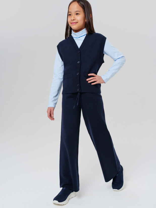 Трикотажный вязаный синий школьный костюм для девочки подростка от PlayToday — идеальное сочетание стиля, комфорта и универсальности для школы и повседневной жизни. Этот элегантный подростковый комплект с классическим школьным жилетом и удобными стильными брюками для девочек станет отличной основой для школьного гардероба и особых случаев.