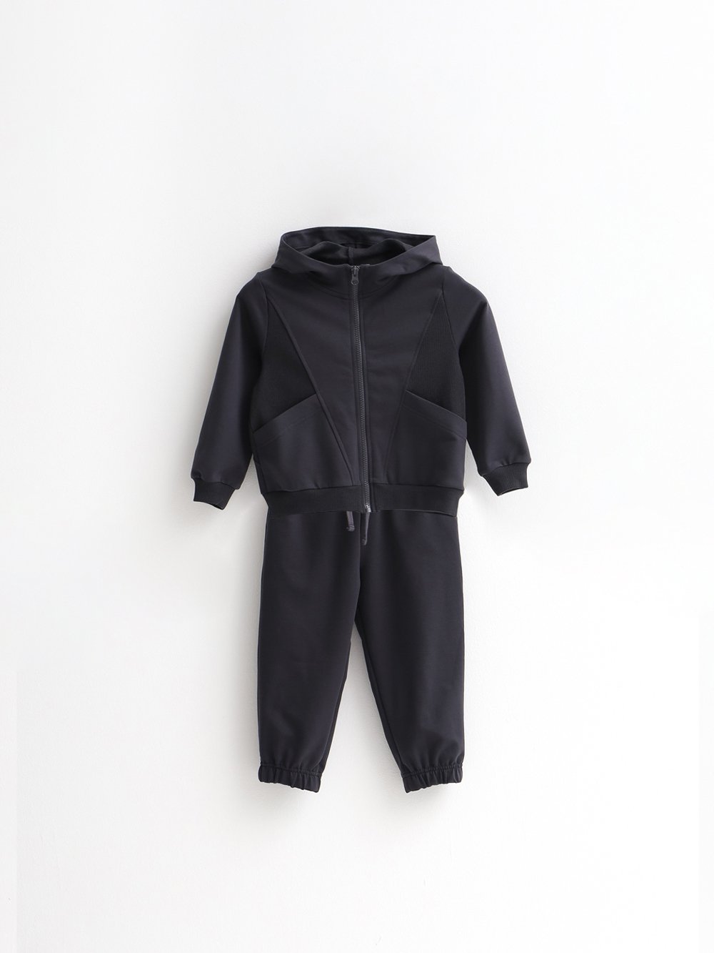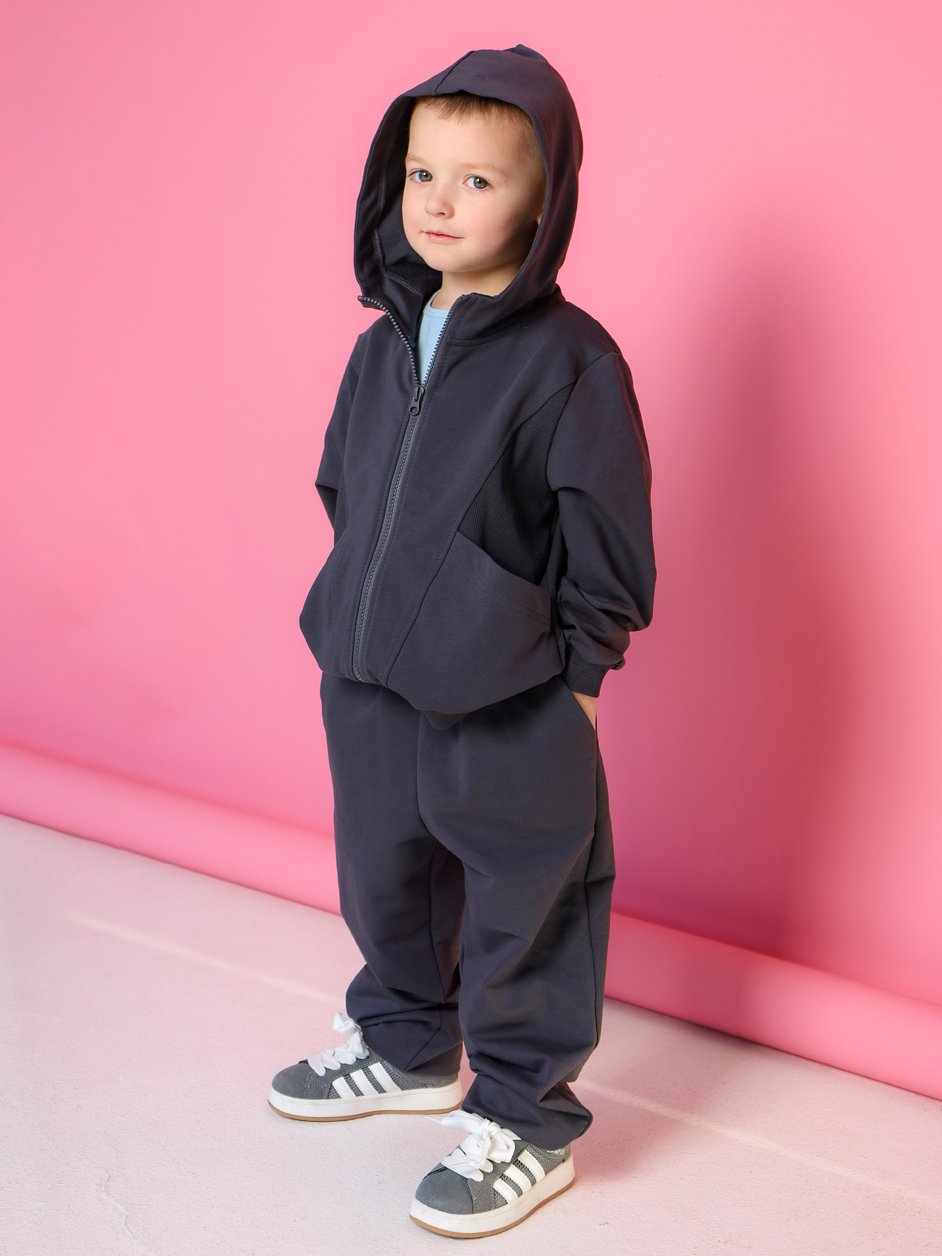 Комплект из толстовки и брюк. Толстовка умеренного объема с центральной застежкой на тракторную молнию. На полочке и спинке рельефные швы. В рельефах карманы с косым входом. Боковые детали, манжета рукава и низ из кашкорсе.