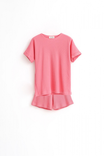 Рубашка свободного кроя, с отложным воротником, с центральной бортовой застежкой на пуговицы. Шорты свободного кроя, с поясом на резинке и карманами с косым входом.