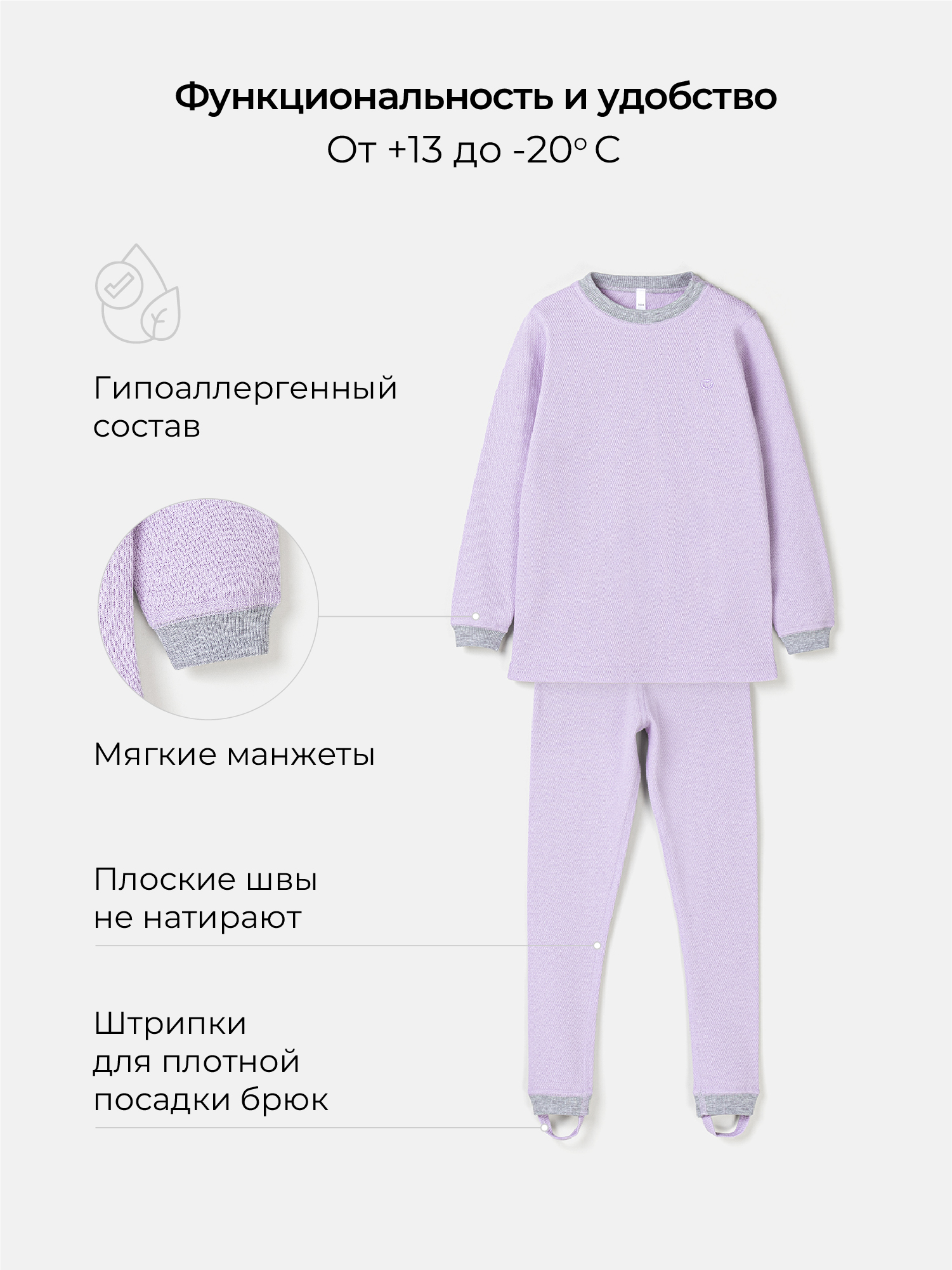 Термополотно сохраняет естественное тепло и отводит влагу – кожа будет сухой даже при активных играх и нагрузках.