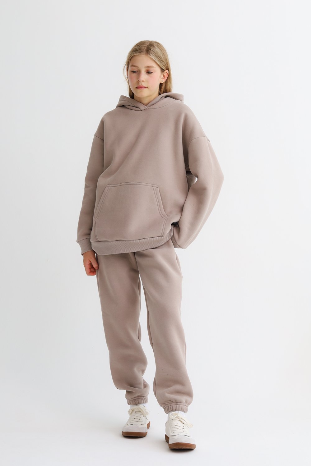 Комплект свободного кроя обеспечит комфорт в каждом движении. Худи с капюшоном и карманом-кенгуру. Брюки с поясом на резинке со шнуром и карманами по бокам.