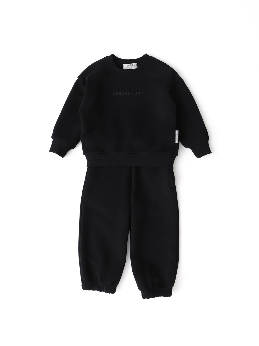 Комплект из футера с peach-эффектом свободного кроя. Свитшот со спущенной линией плеча, манжетами на рукавах и по низу изделия из кашкорсе. Резиновый принт спереди.