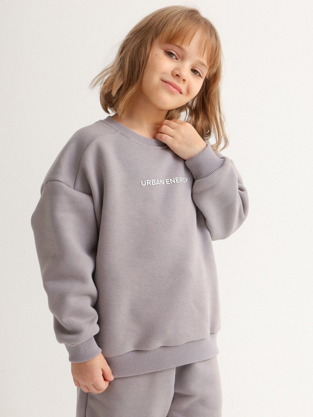 Комплект из футера с peach-эффектом свободного кроя. Свитшот со спущенной линией плеча, манжетами на рукавах и по низу изделия из кашкорсе. Резиновый принт спереди.