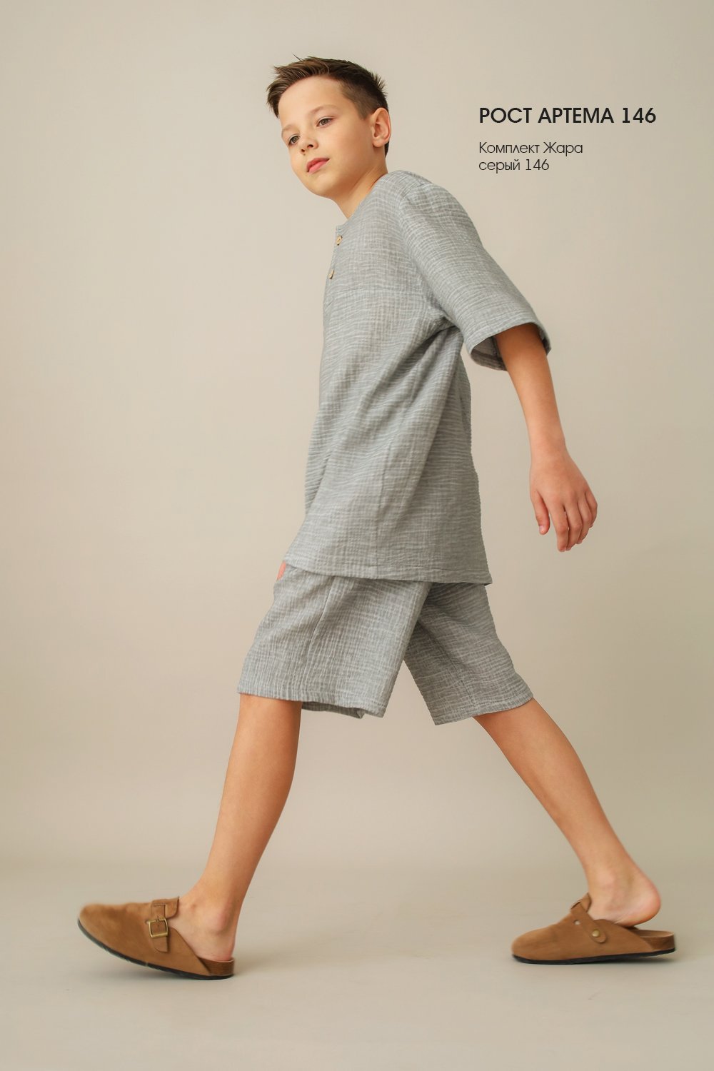 Рубашка прямого силуэта с отрезной кокеткой, короткий рукав, планка на двух пуговицах. Шорты свободного кроя, с цельнокроеным поясом с резинкой.