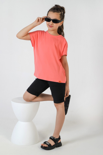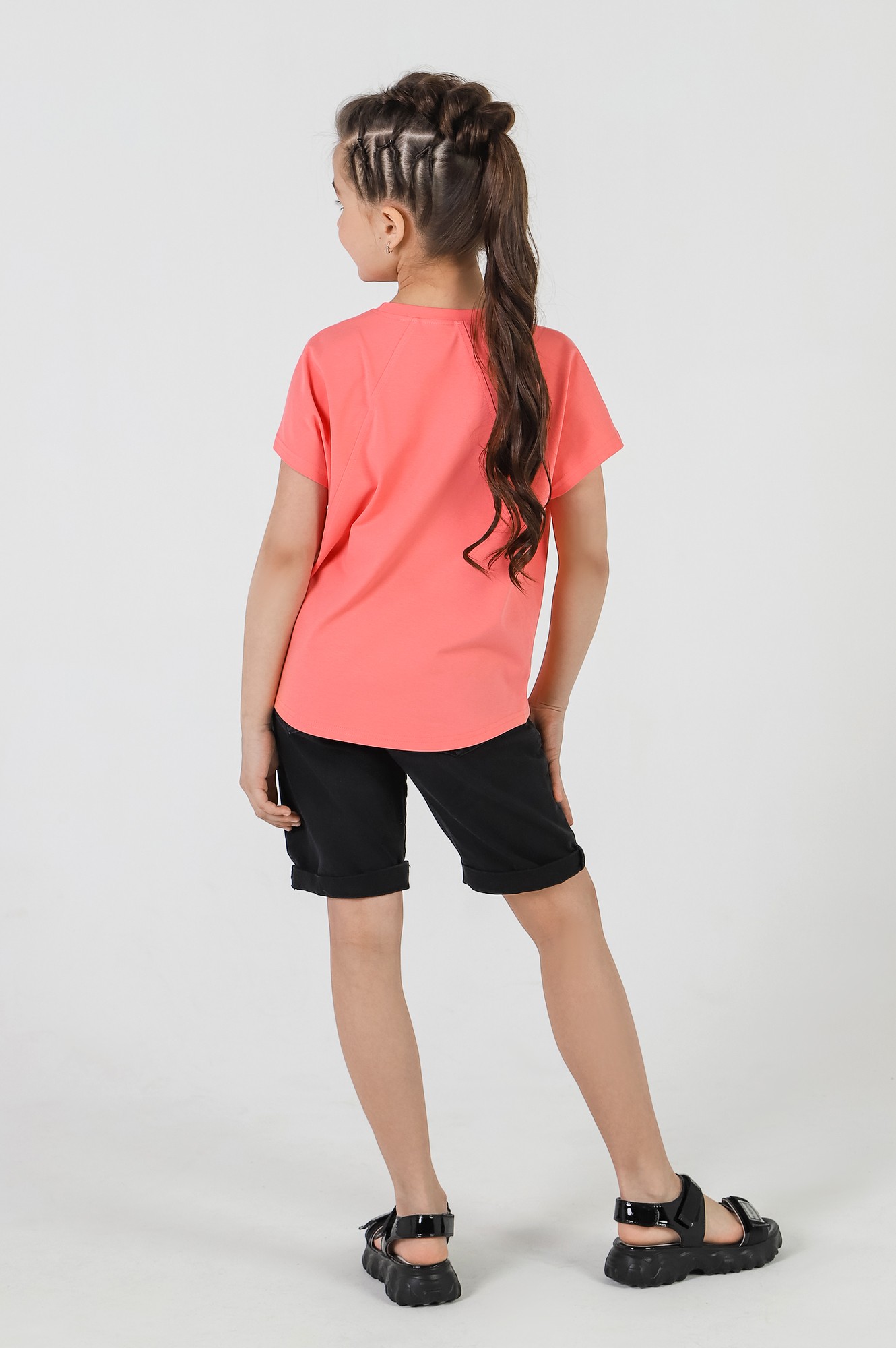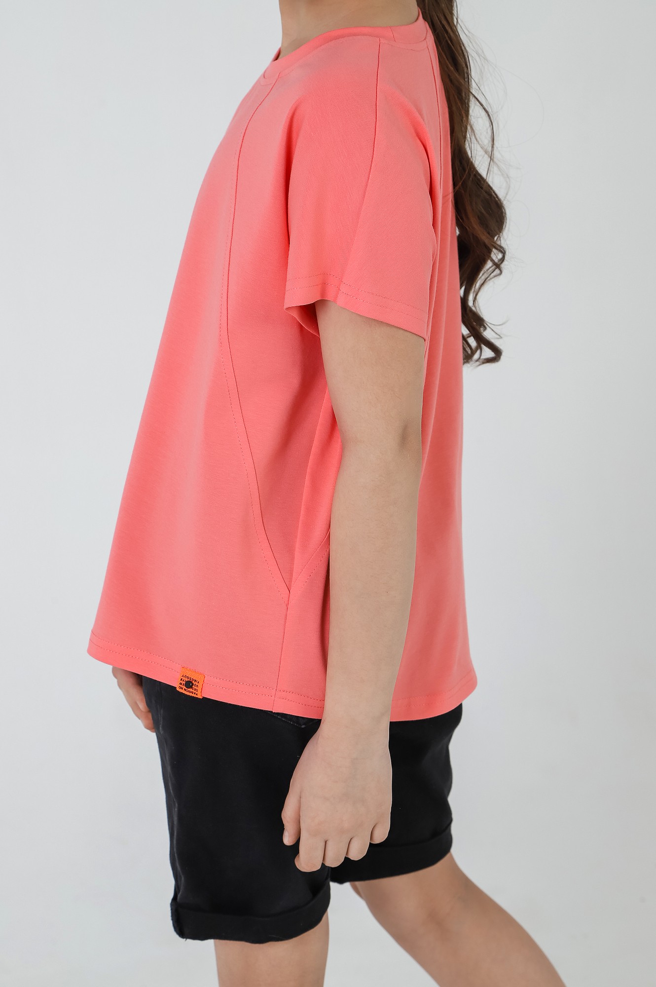Футболка для девочки, модной объемно-силуэтной формы, свободная в верхней части. Модель с наклонными отстроченными швами по переду и спинке, фигурной линией низа (с небольшим удлинением сзади). Рукава короткие цельнокроенные.