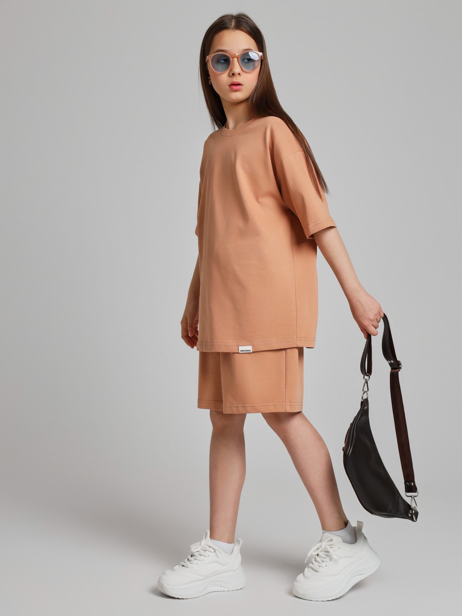 Костюм для девочки из плотного гладкокрашеного трикотажного полотна "кулирка", состоящий из футболки и шорт. Футболка - свободного покроя, с удлиненными плечевым и швами, короткими втачными рукавами и горловиной овальной формы, обработанной втачной планкой. В нижней части переда слева настрочен декоративный элемент прямоугольной формы. По горловине проложена отделочная строчка. Шорты - классического покроя, на притачном поясе с эластичной тесьмой внутри и карманами в боковых швах. Для регулирования степени прилегания шорт по талии в пояс вставлен шнурок, продетый через два отверстия в соединительных швах в центре пояса.
