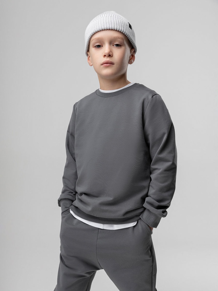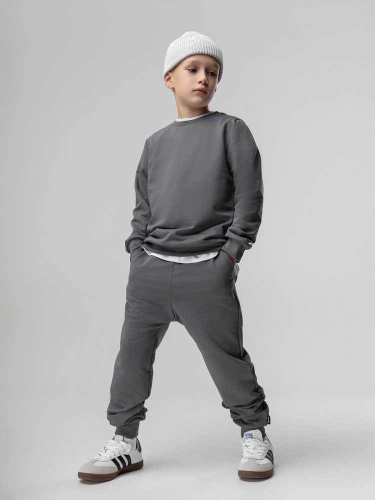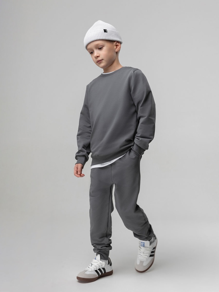 Материал футер двухнитка Состав 92% хлопок 8% лайкра Костюм детский. Свитшот, полуприлегающий покрой, рукава на манжетах, Брюки- джоггеры. Детали: пояс - эластичная резинка, низ изделия- манжеты, карманы с отрезным бочком. Состав: футер двухнитка 92% хлопок 8% лайкра