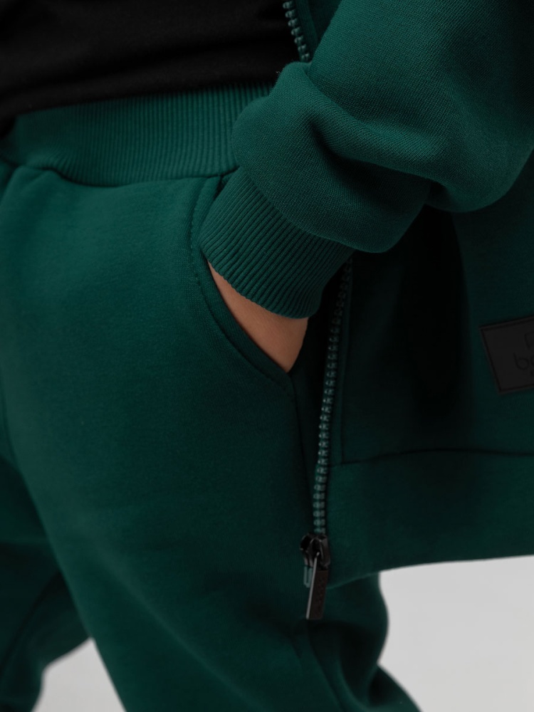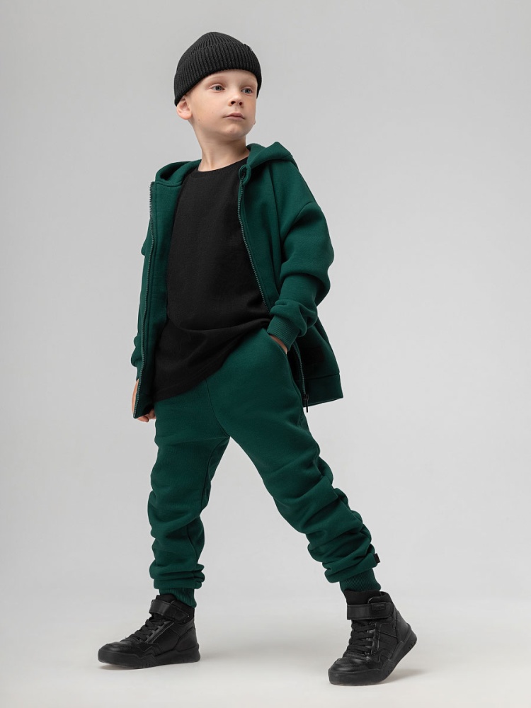 Материал футер трехнитка с начесом Состав 80% хлопок 20% полиэстер Костюм детский. Толстовка: свободный покрой, застежка - молния, рукава на манжетах, защитная планка на молнии, несъемный капюшон, прорезные карманы. Брюки- джоггеры, детали: пояс - эластичная резинка, низ изделия - манжеты, карманы с отрезным бочком. Состав: футер трехнитка с начесом 80% хлопок 20% полиэстер