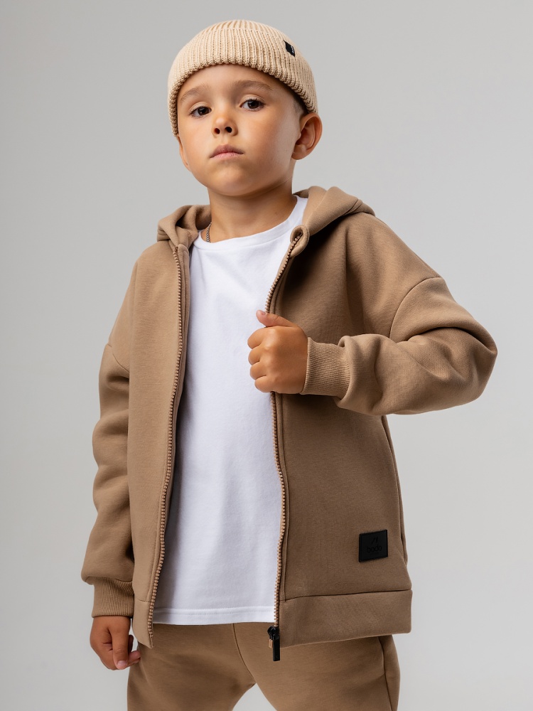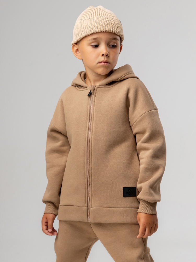 Материал футер трехнитка с начесом Состав 80% хлопок 20% полиэстер Костюм детский. Толстовка: свободный покрой, застежка - молния, рукава на манжетах, защитная планка на молнии, несъемный капюшон, прорезные карманы. Брюки- джоггеры, детали: пояс - эластичная резинка, низ изделия - манжеты, карманы с отрезным бочком. Состав: футер трехнитка с начесом 80% хлопок 20% полиэстер