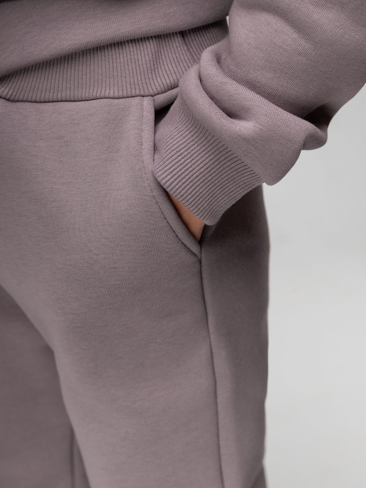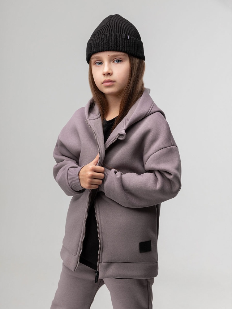 Материал футер трехнитка с начесом Состав 80% хлопок 20% полиэстер Костюм детский. Толстовка: свободный покрой, застежка - молния, рукава на манжетах, защитная планка на молнии, несъемный капюшон, прорезные карманы. Брюки- джоггеры, детали: пояс - эластичная резинка, низ изделия - манжеты, карманы с отрезным бочком. Состав: футер трехнитка с начесом 80% хлопок 20% полиэстер