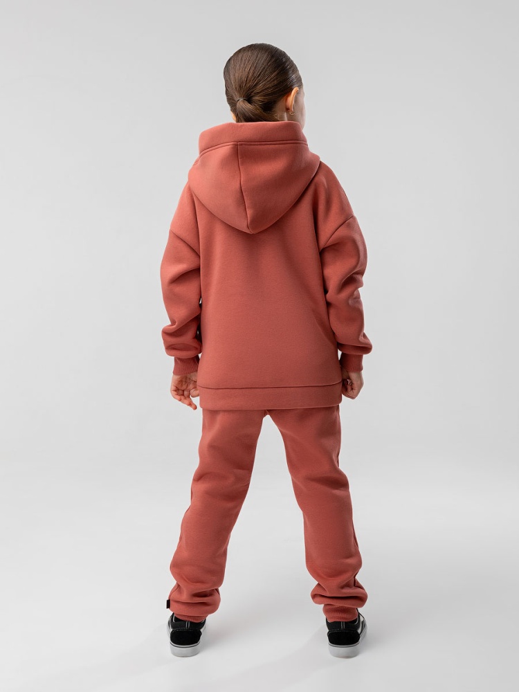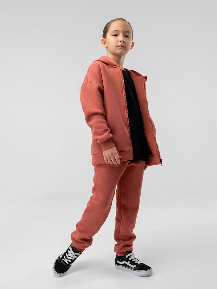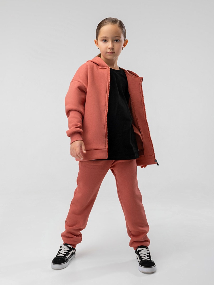Материал футер трехнитка с начесом Состав 80% хлопок 20% полиэстер Костюм детский. Толстовка: свободный покрой, застежка - молния, рукава на манжетах, защитная планка на молнии, несъемный капюшон, прорезные карманы. Брюки- джоггеры, детали: пояс - эластичная резинка, низ изделия - манжеты, карманы с отрезным бочком. Состав: футер трехнитка с начесом 80% хлопок 20% полиэстер