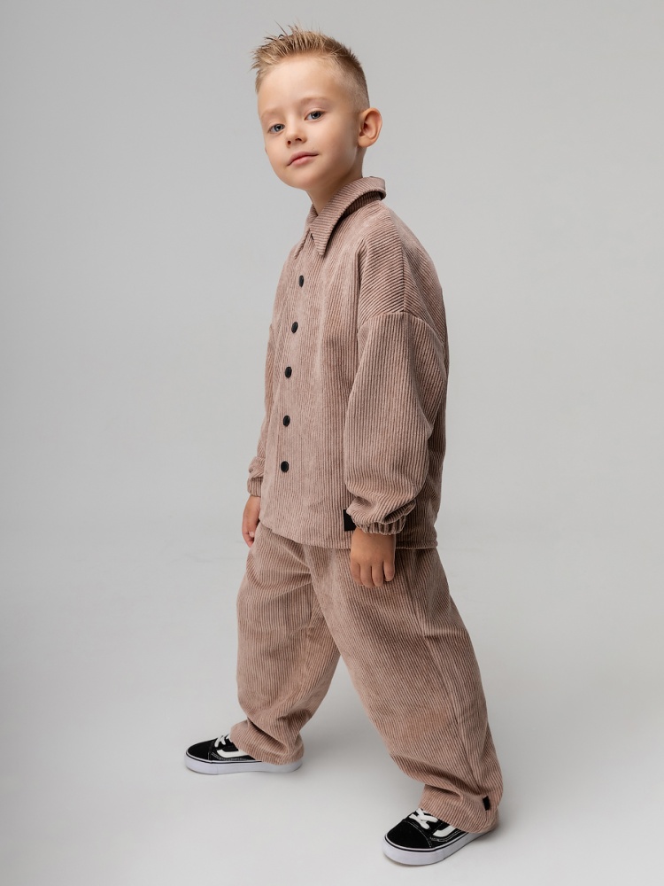 Материал вельвет Состав 100% полиэстер Костюм для детей дошкольного возраста. Рубашка без подкладки, прямого силуэта, с центральной бортовой застёжкой на кнопки, с отложным воротником, с втачными рукавами на резинке. Низ изделия ровный. Брюки свободного силуэта, расширенные в бёдрах и заужены к низу, на притачном поясе с внутренней резинкой, брюки с боковыми карманами. Низ изделия прямой.