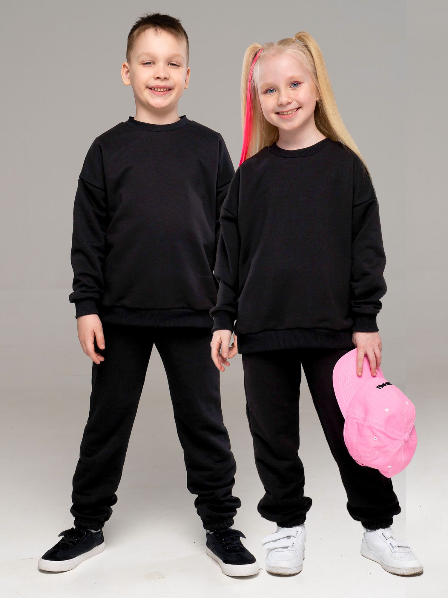 Костюм изготовлен из мягкого и приятного на ощупь материала, обеспечивающего максимальный комфорт при ношении. Свободная посадка толстовки позволяет детям свободно двигаться, не ощущая дискомфорта или стеснения. Брюки имеют полуприлегающий силуэт и обеспечивают идеальную свободу движения для спорта или прогулок. Этот из футера(3х нитка) черного цвета костюм даже подойдет для ношения в школу.