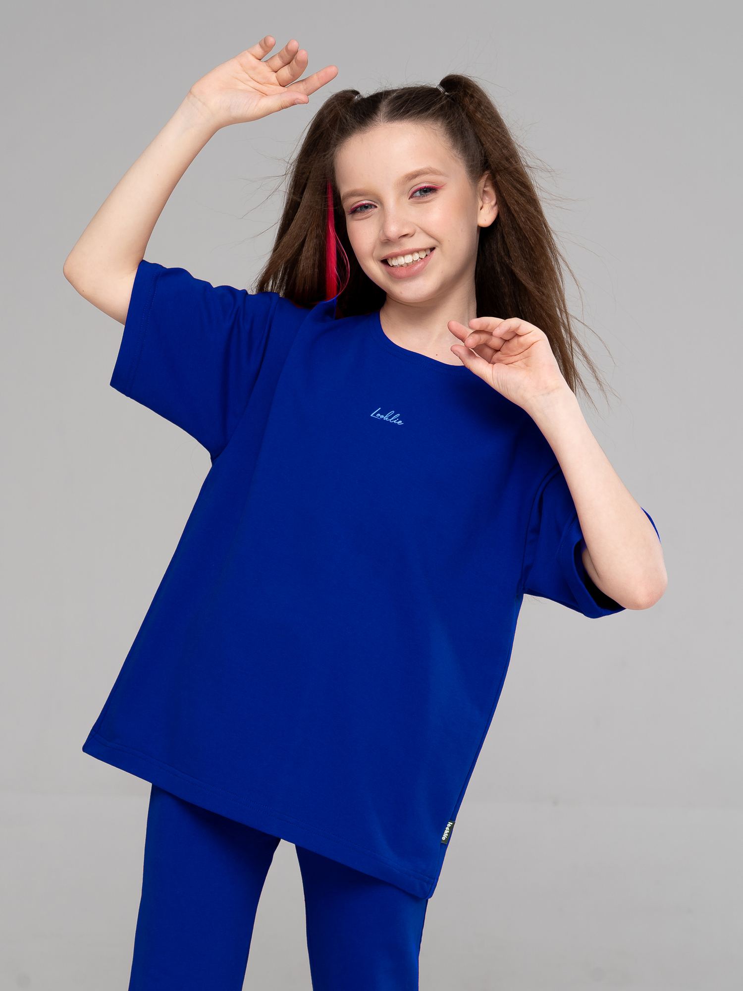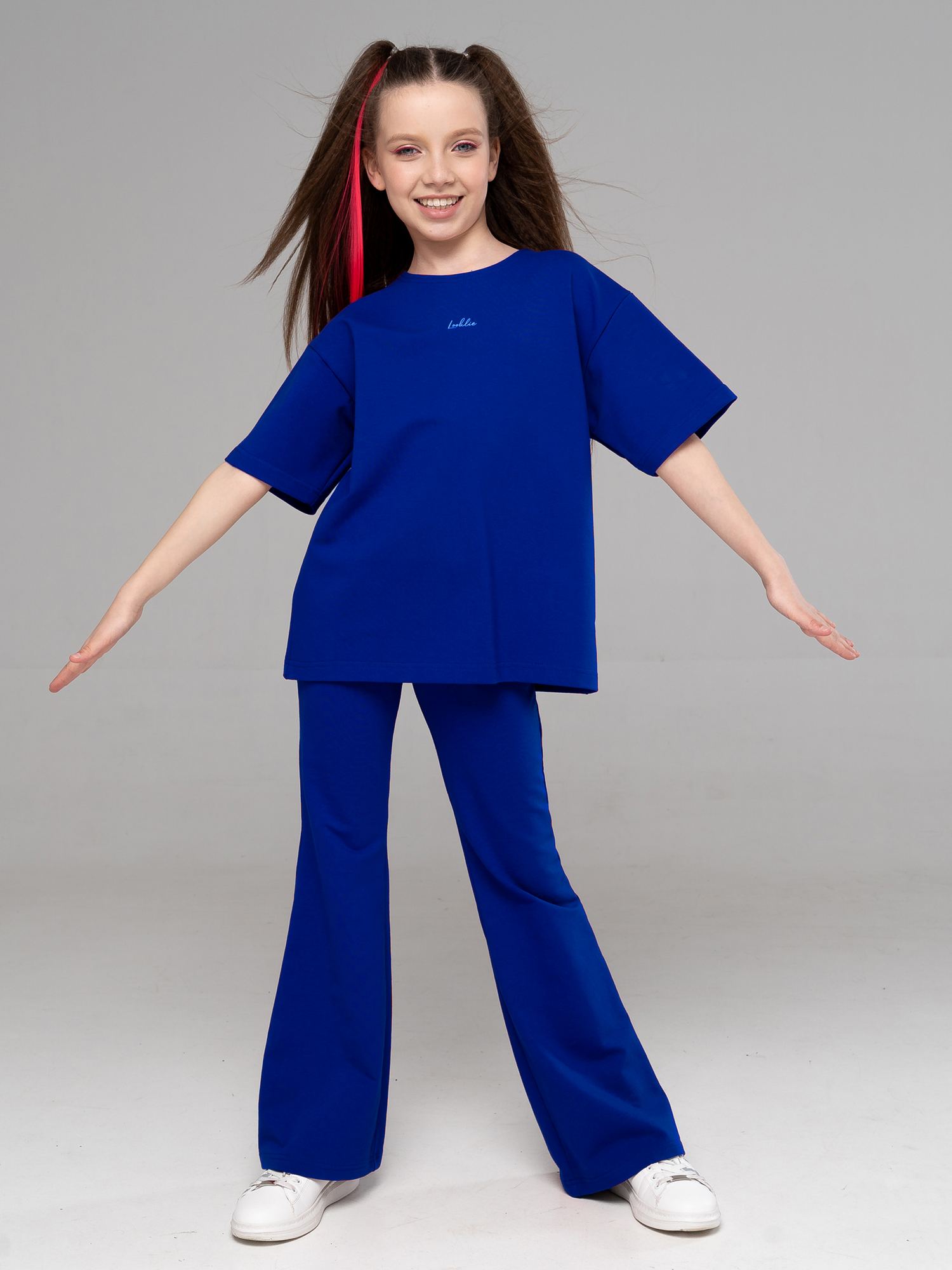 Костюм двойка для девочки из футера василькового цвета для девочки состоит из футболки свободного силуэта со спущенной линией плеча, рукавами до уровня локтя и брюк- клеш. На груди- небольшой принт. Костюм двойка- это отличный выбор для создания модного и стильного летнего образа. Превосходное сочетание практичности и удобства, этот костюм станет незаменимым элементом гардероба Вашей девочки. Привлекательный, летний дизайн и свободная посадка обеспечивают комфорт даже в самые жаркие дни.