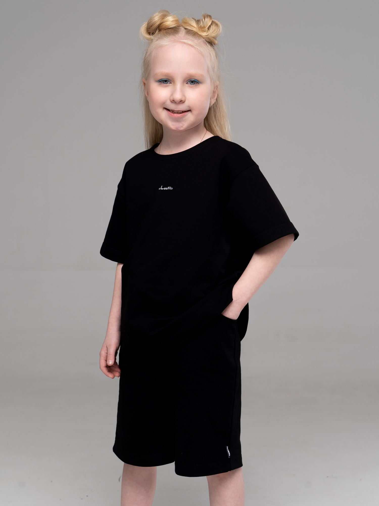 Костюм двойка из футера черного цвета для девочки , состоит из удлиненной футболки свободного силуэта и прямых шорт. Это идеальное решение для обновления гардероба Вашей маленькой модницы на летний сезон. Легкий и удобный костюм представляет собой практичное решение для повседневной носки в жаркую погоду. Он идеально подходит для спорта, активного отдыха и просто для прогулок.