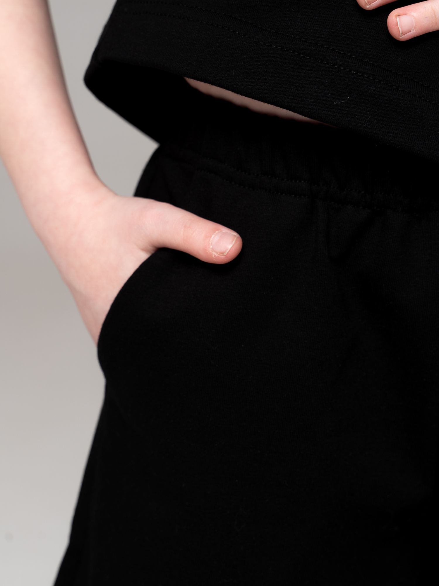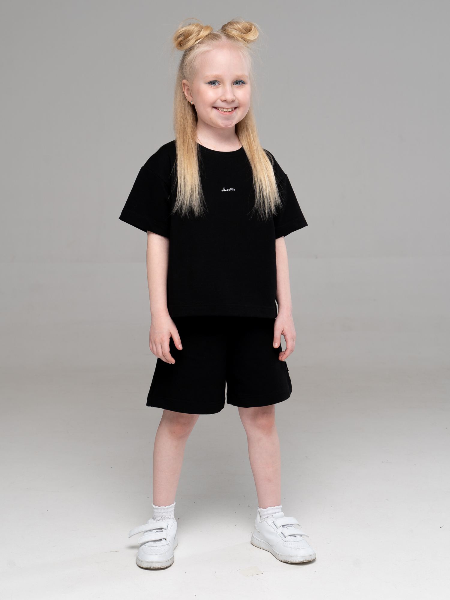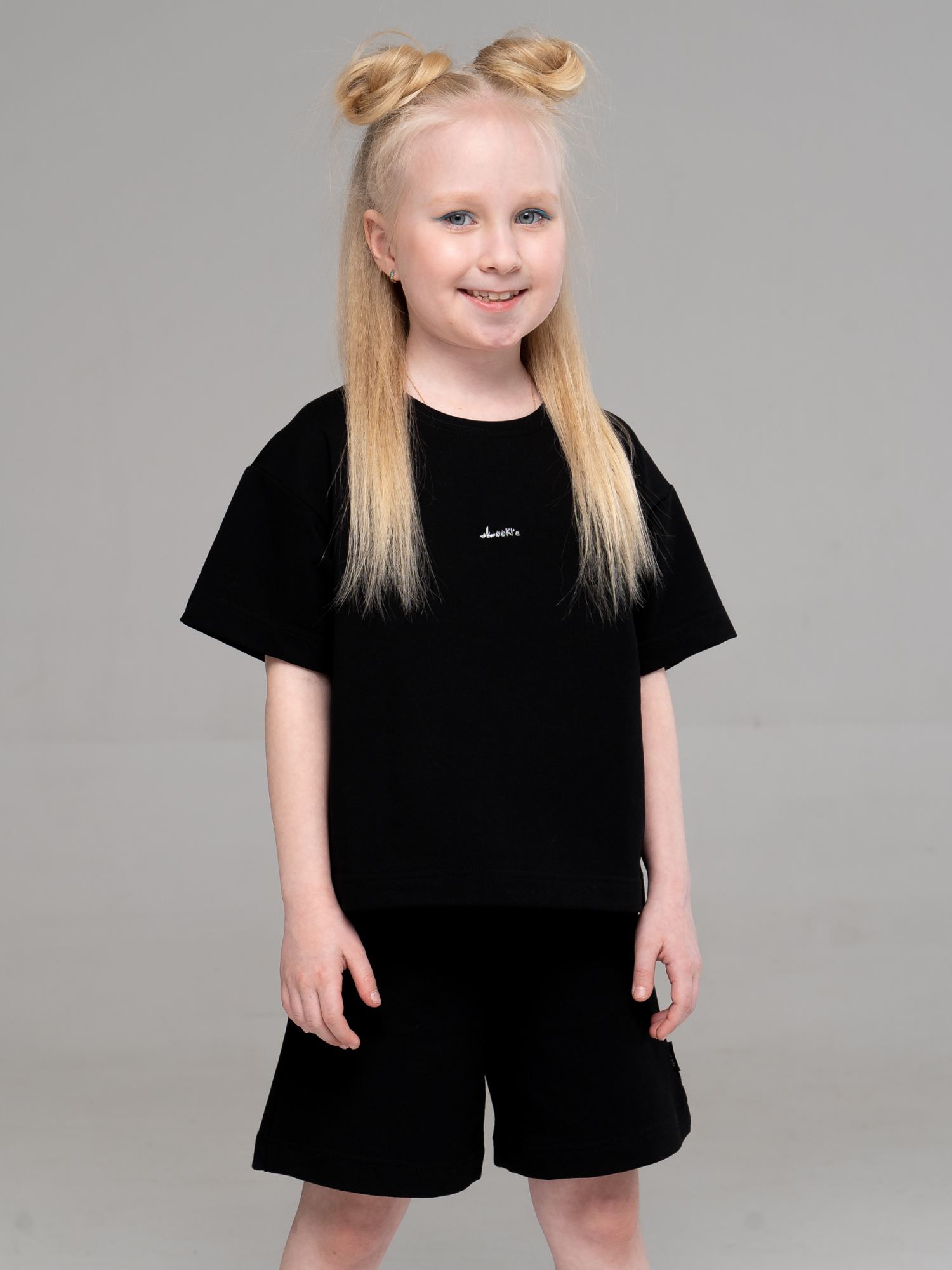 Костюм- двойка из футера черного цвета для девочки . Состоит из футболки и шорт. Укороченная футболка свободного силуэта со спущенной линией плеча и рукавами длиной до локтя. Удобные шорты с боковыми карманами, пояс на эластичной резинке. Изделие выполнено из трикотажа премиального качества - ПЕНЬЕ, с содержанием хлопка более 92%
