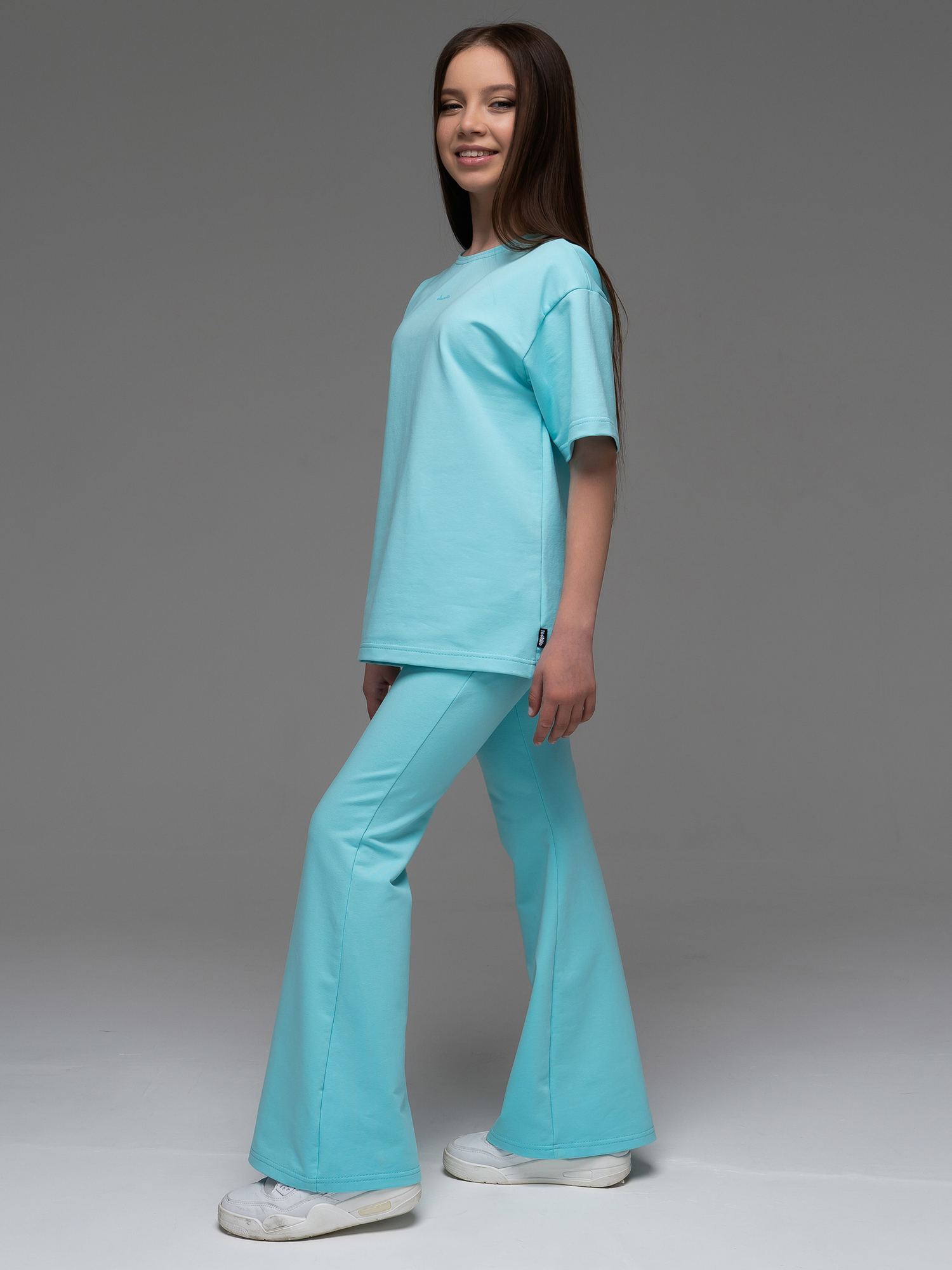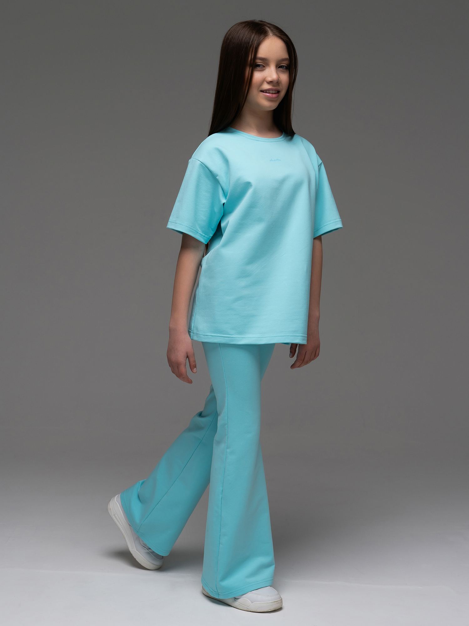 Костюм двойка для девочки из футера ментолового цвета для девочки состоит из футболки свободного силуэта со спущенной линией плеча, рукавами до уровня локтя и брюк- клеш. На груди- небольшой принт. Костюм двойка- это отличный выбор для создания модного и стильного летнего образа. Превосходное сочетание практичности и удобства, этот костюм станет незаменимым элементом гардероба Вашей девочки. Привлекательный, летний дизайн и свободная посадка обеспечивают комфорт даже в самые жаркие дни.