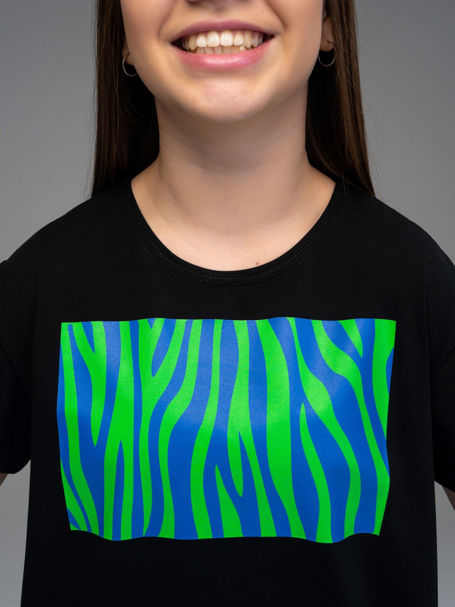 Костюм двойка для девочки из футера черного цвета для девочки состоит из футболки свободного силуэта со спущенной линией плеча, рукавами до уровня локтя и брюк- клеш. На груди футболки- яркий анималистичный принт. Костюм двойка- это отличный выбор для создания модного и стильного летнего образа. Превосходное сочетание практичности и удобства, этот костюм станет незаменимым элементом гардероба Вашей девочки. Привлекательный, летний дизайн и свободная посадка обеспечивают комфорт даже в самые жаркие дни.