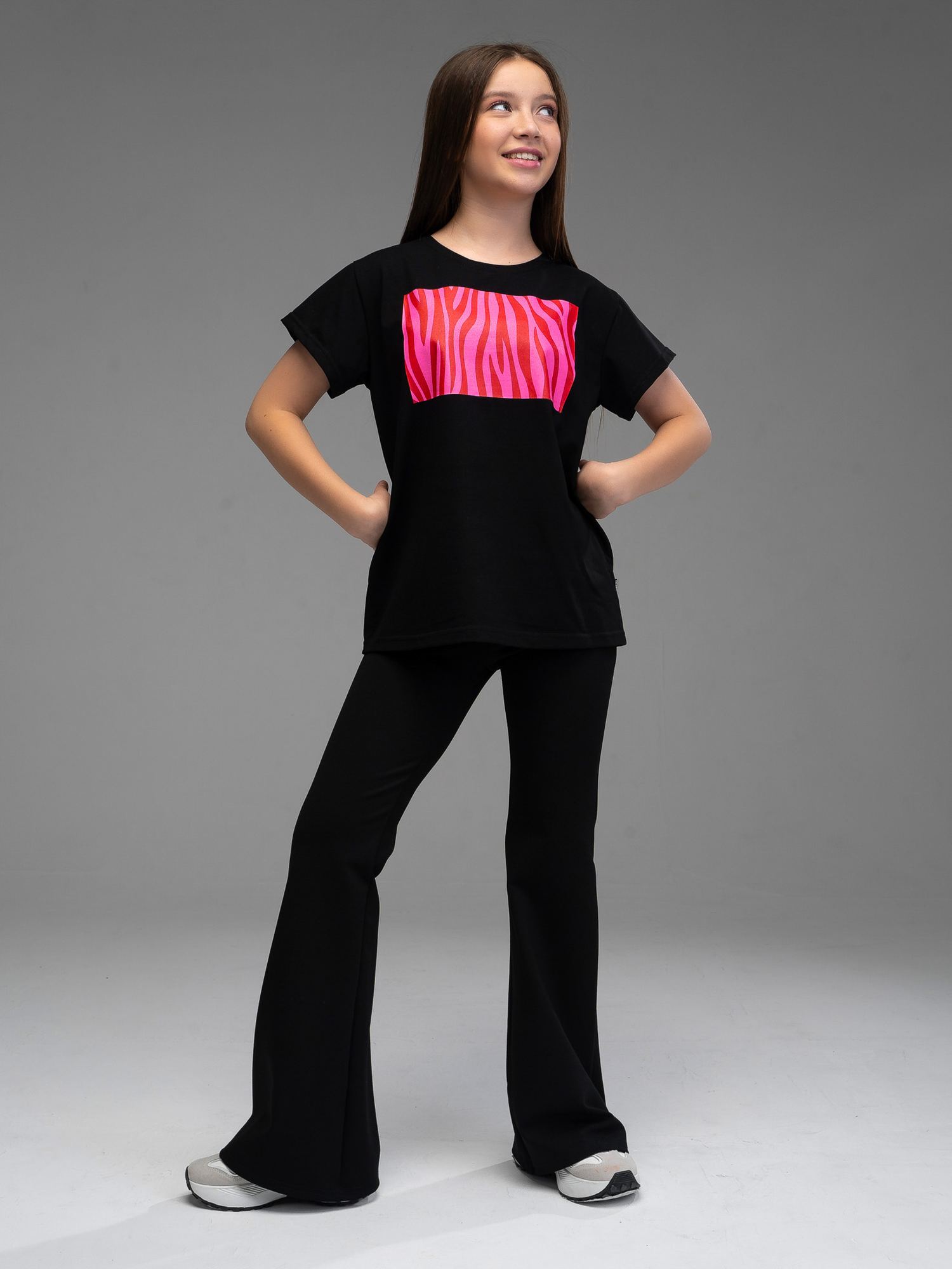 Костюм двойка для девочки из футера черного цвета для девочки состоит из футболки свободного силуэта со спущенной линией плеча, рукавами до уровня локтя и брюк- клеш. На груди футболки- яркий анималистичный принт. Костюм двойка- это отличный выбор для создания модного и стильного летнего образа. Превосходное сочетание практичности и удобства, этот костюм станет незаменимым элементом гардероба Вашей девочки. Привлекательный, летний дизайн и свободная посадка обеспечивают комфорт даже в самые жаркие дни.