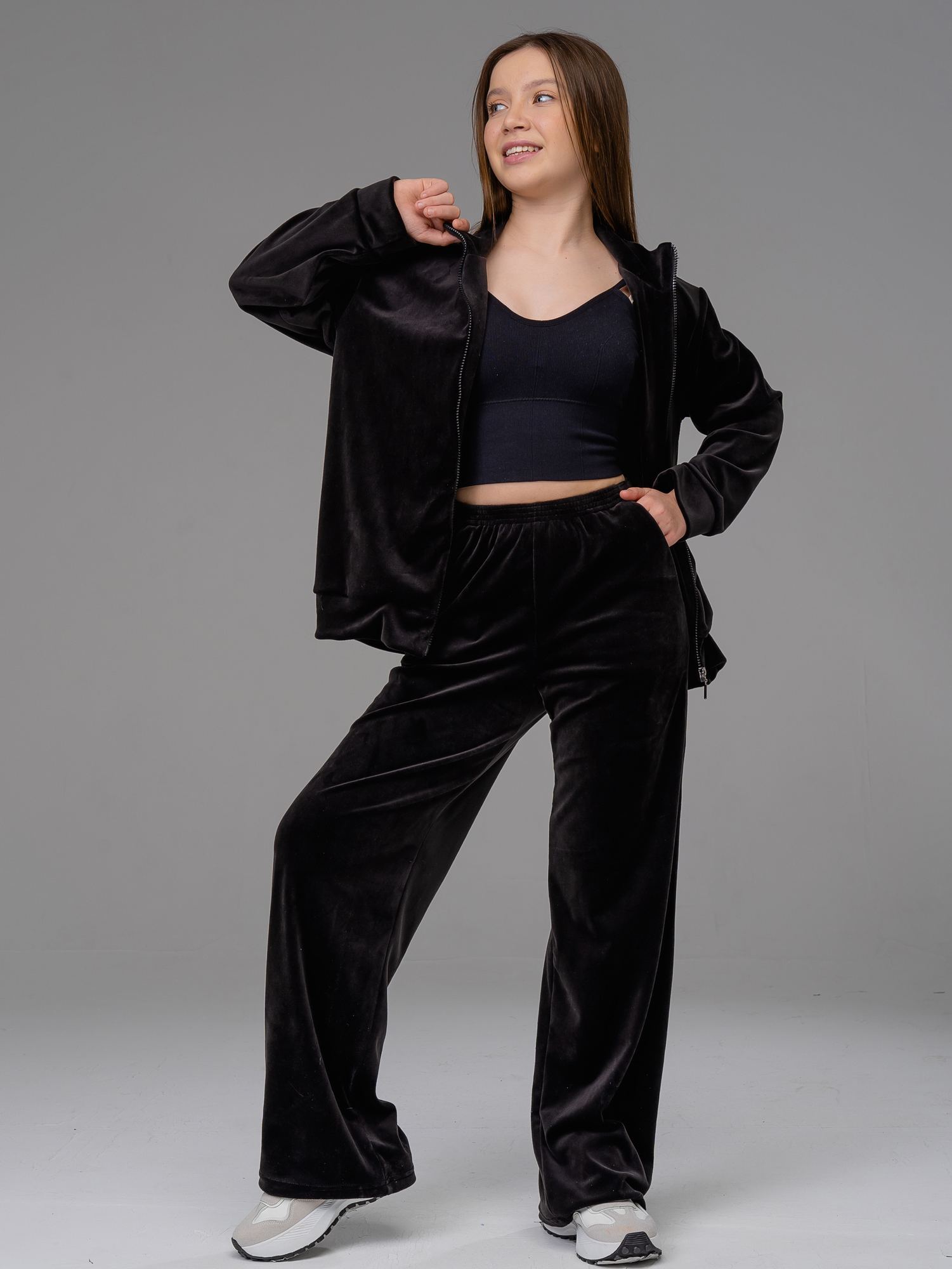 Спортивный костюм из велюра черного цвета для девочки , от российского производителя ""Looklie"" - трендовый образ весны 2025! Этот модный детский велюровый комплект на молнии выполнен из мягкого бархатного материала премиум - качества, что обеспечивает максимальный комфорт и тепло в демисезонный период. Этот демисезонный брючный костюм для подростка - настоящее воплощение модных тенденций.