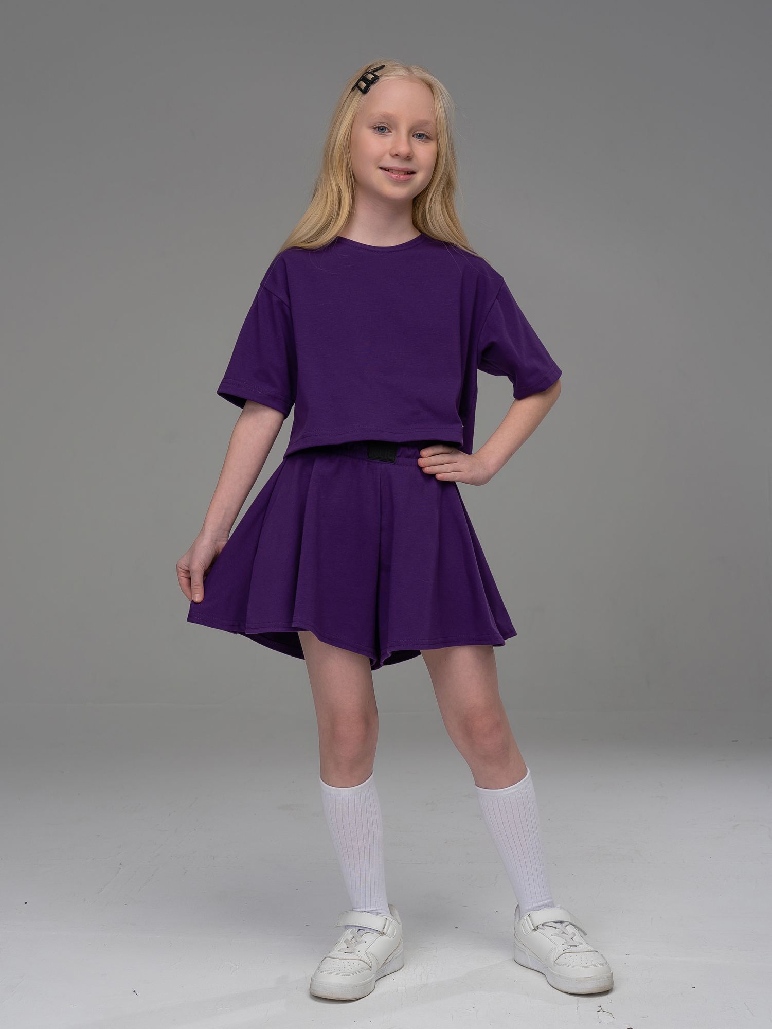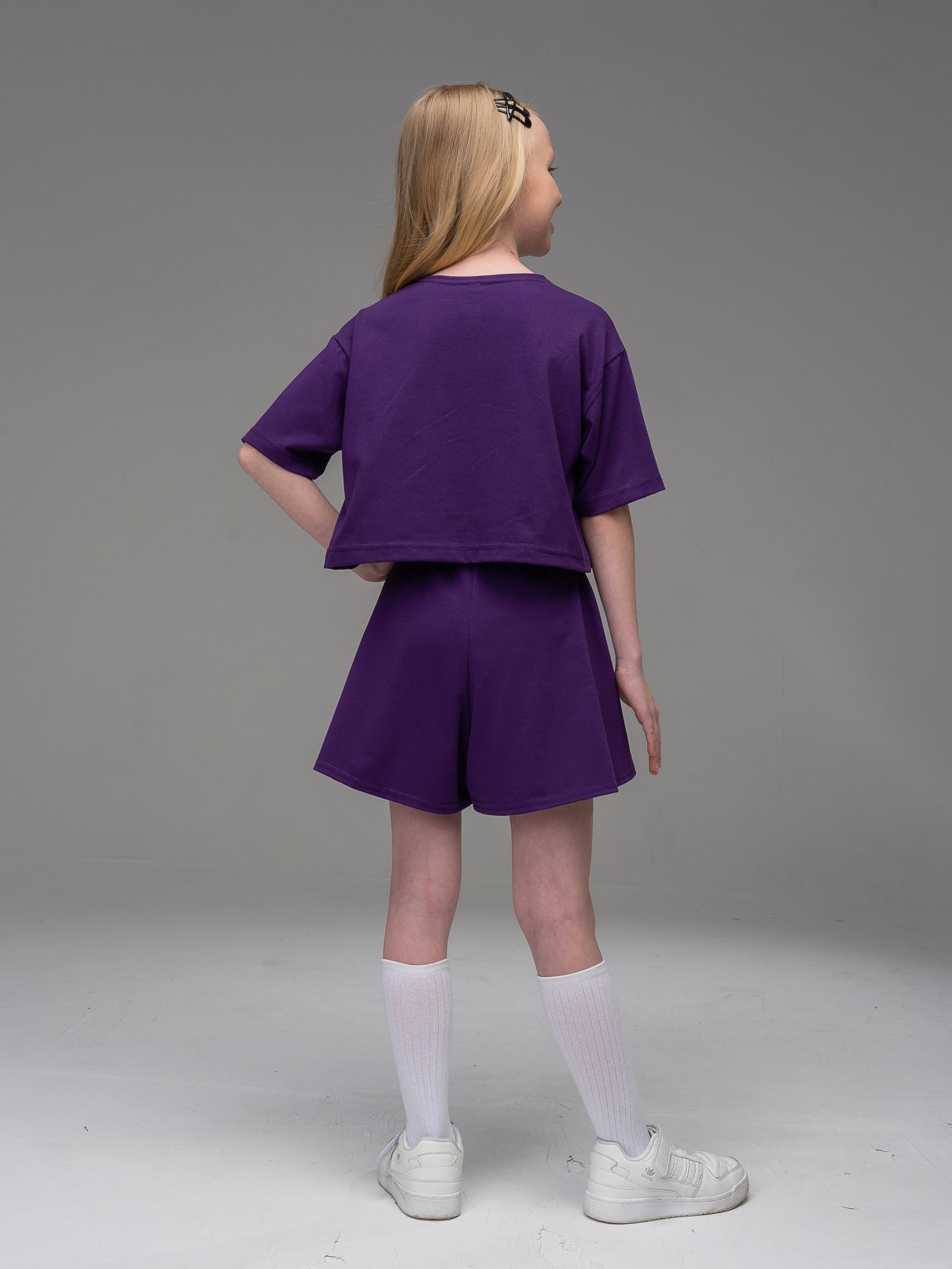 Костюм двойка из кулирки фиолетового цвета для девочки. Состоит из футболки свободного силуэта со спущенной линией плеча, рукавами до уровня локтя и расклешенных шорт. Костюм двойка- это отличный выбор для создания модного и стильного летнего образа. Превосходное сочетание практичности и удобства, этот костюм станет незаменимым элементом гардероба Вашей девочки. Привлекательный, летний дизайн и свободная посадка обеспечивают комфорт даже в самые жаркие дни.