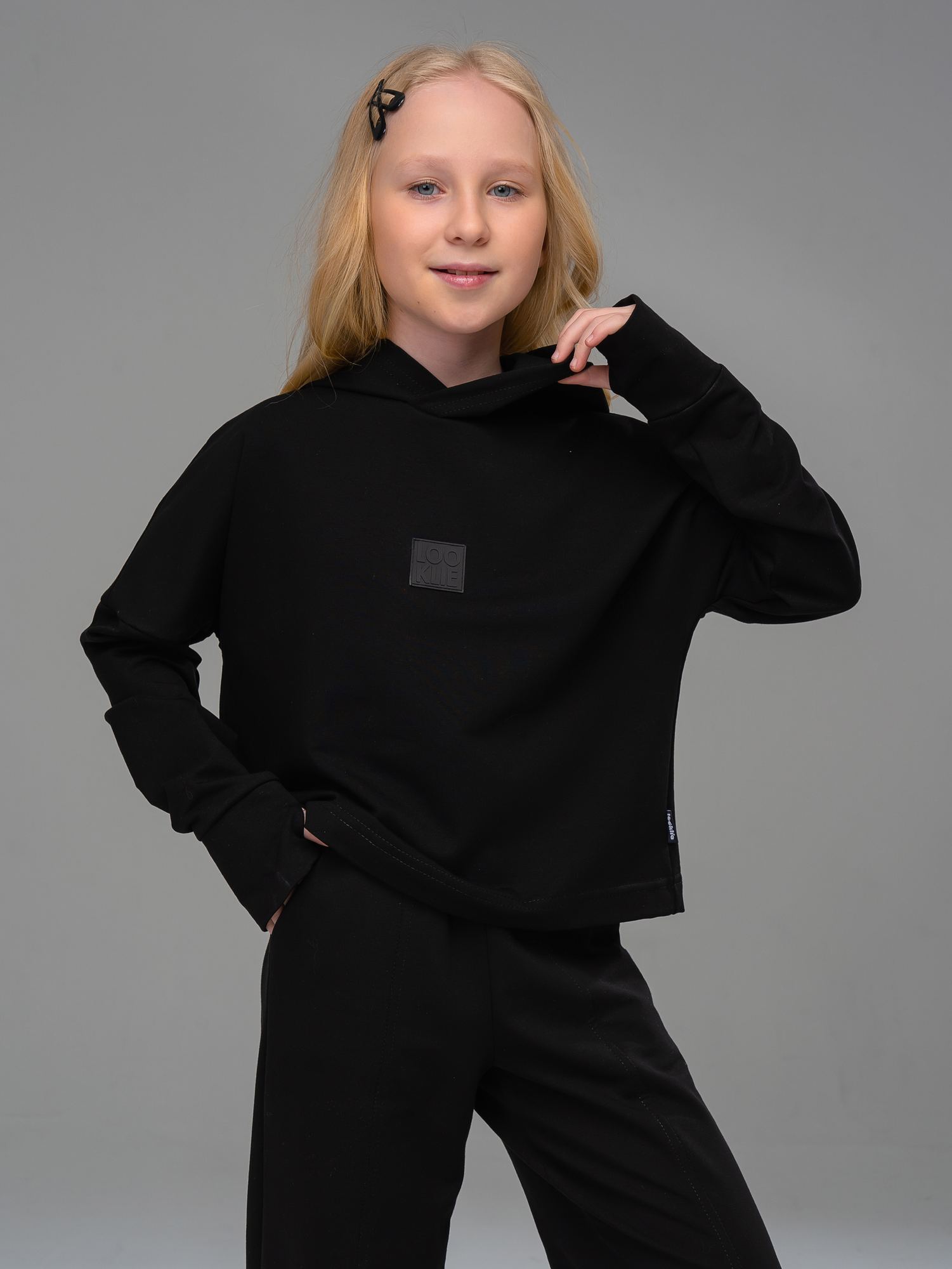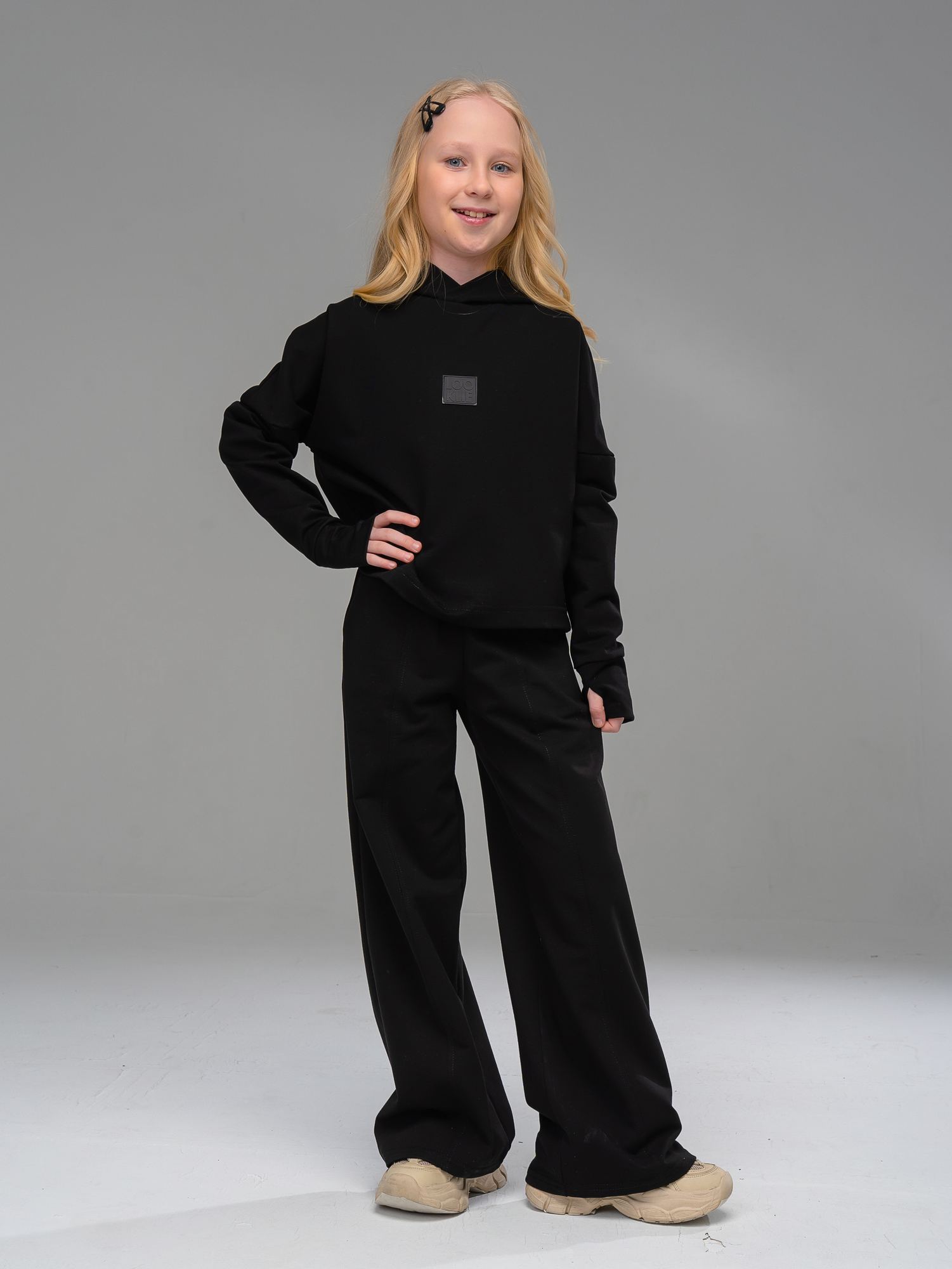 Костюм двойка для девочки из футера черного цвета для девочки состоит из укороченной толстовки свободного силуэта со спущенной линией плеча, длинными рукавами с манжетами-митенками и капюшоном и брюк. Костюм двойка- это отличный выбор для создания модного и стильного образа. Превосходное сочетание практичности и удобства, этот костюм станет незаменимым элементом гардероба Вашей девочки. Привлекательный дизайн и свободная посадка обеспечивают комфорт и презентабельность.