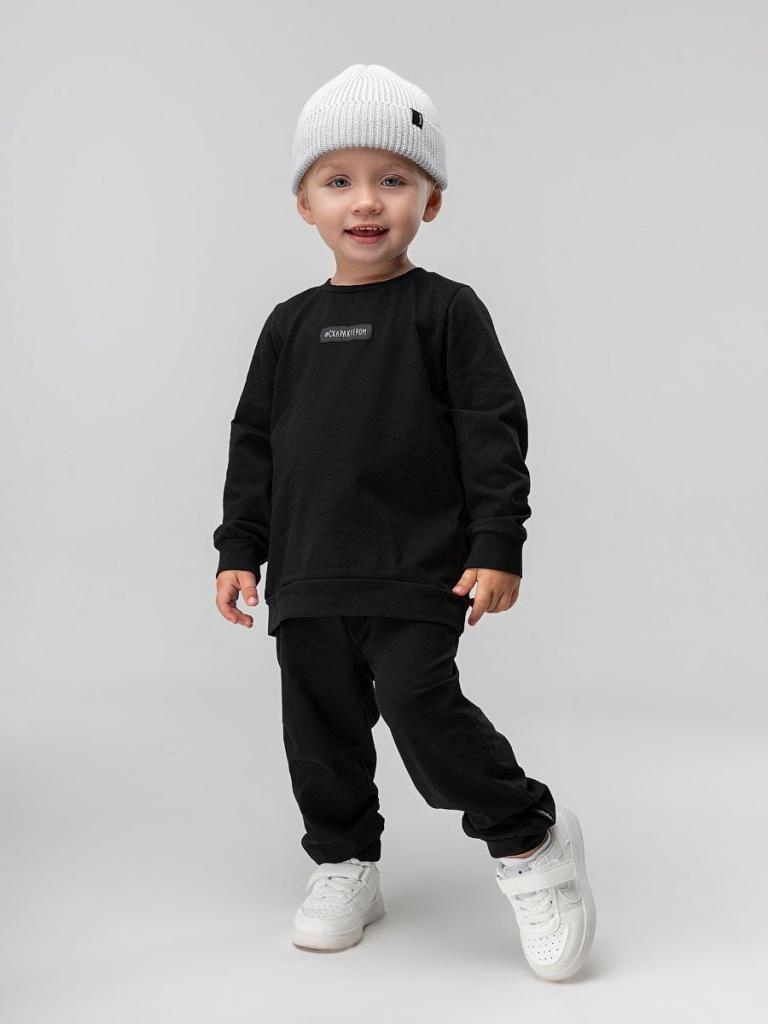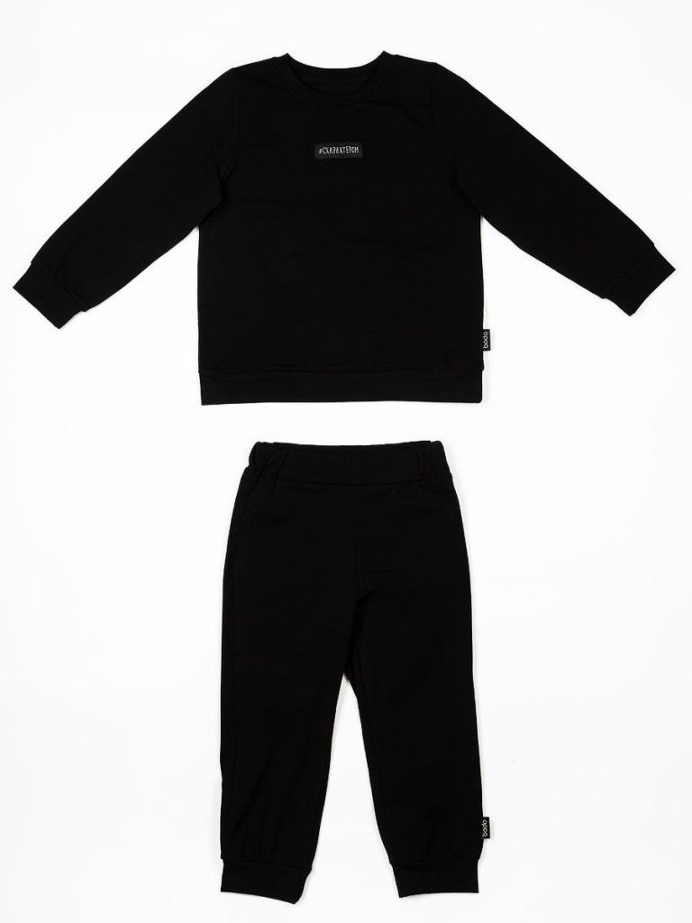 Артикул 21-116MU Материал кулирная гладь Состав 92% хлопок 8% лайкра Костюм для малышей: свитшот и брюки. Прямой свитшот без подкладки с поясом по низу изделия, рукавами с манжетой. На полочке нашивка "с характером". Прямые брюки на поясе с внутренней резинкой. Брюки с манжетой.