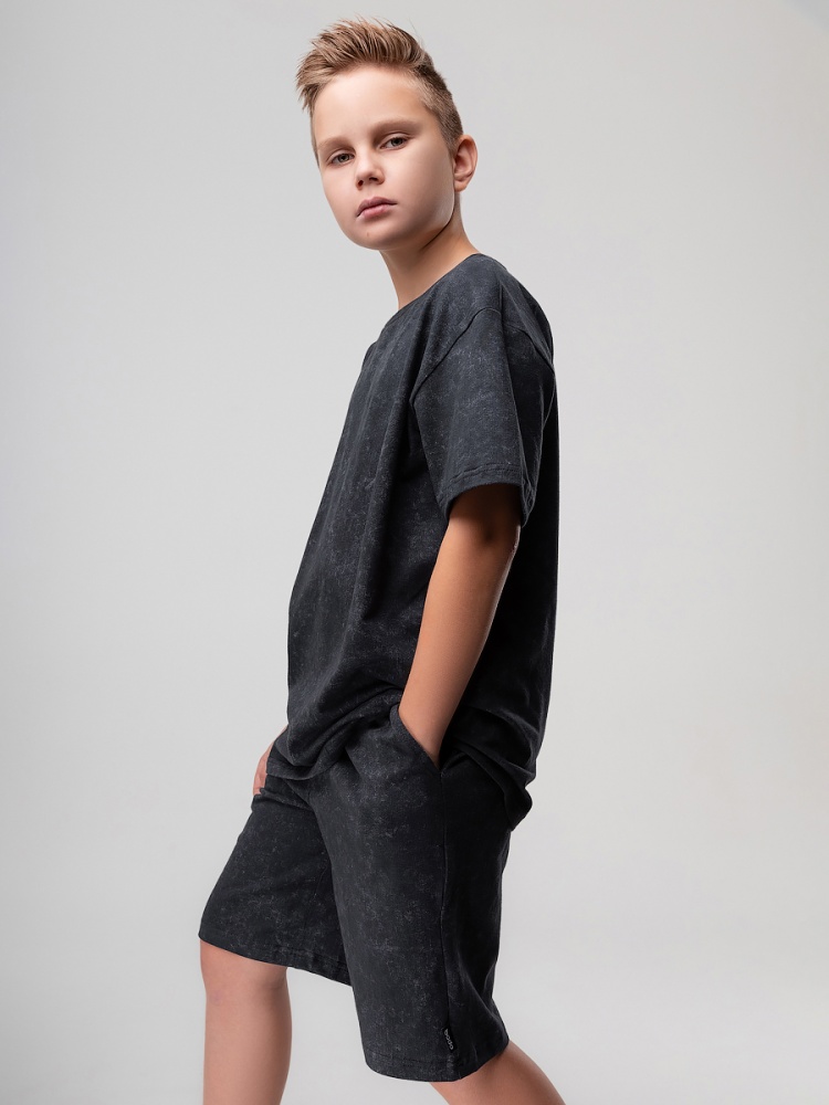 Материал кулирная гладь Состав 92% хлопок 8% лайкра Костюм для детей и подростков. Шорты, детали: свободный покрой, пояс - эластичная резинка, карманы с отрезным бочком. Футболка, детали: короткие рукава, свободный покрой, округлый вырез горловины. Состав: кулирная гладь 92% хлопок 8% лайкра
