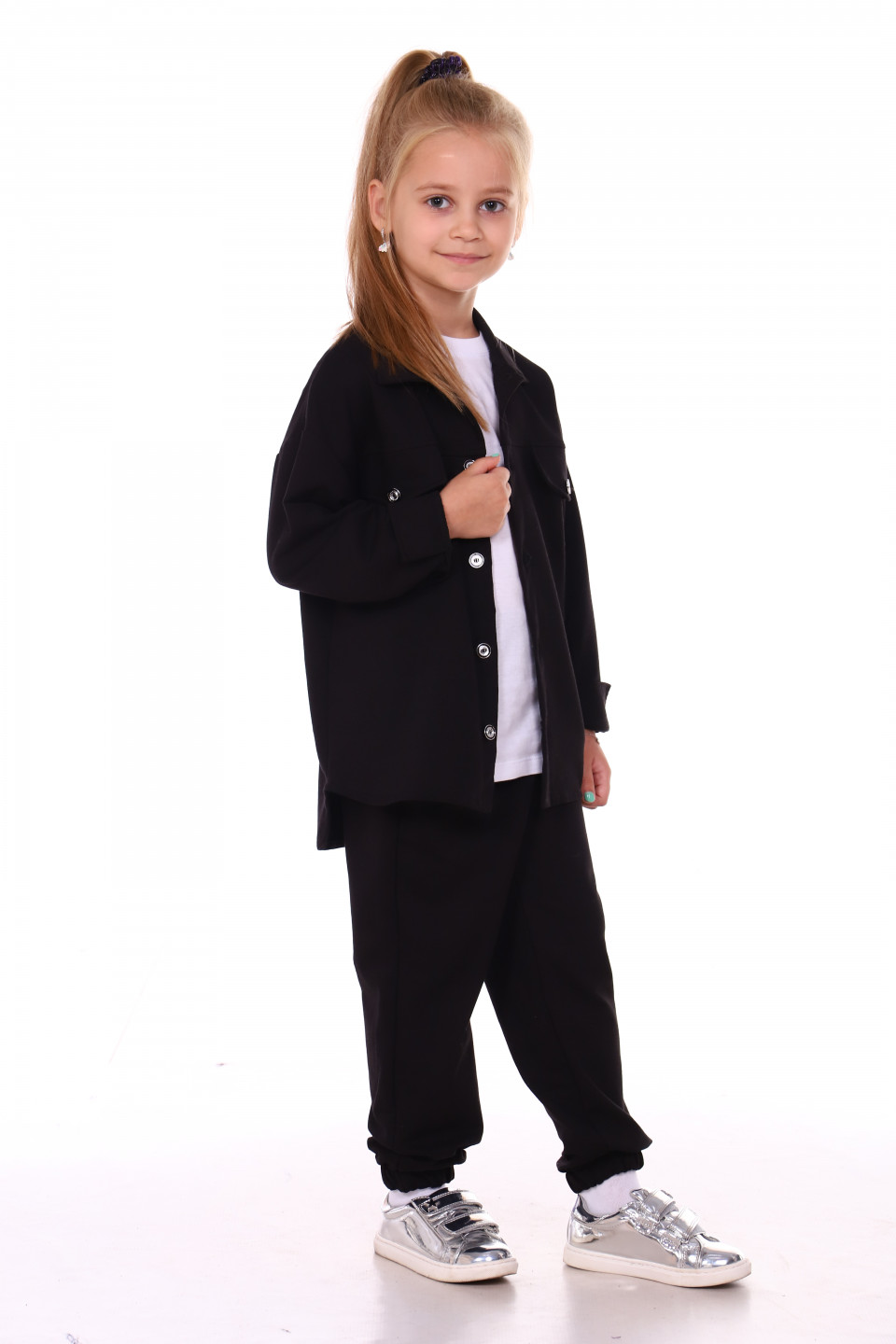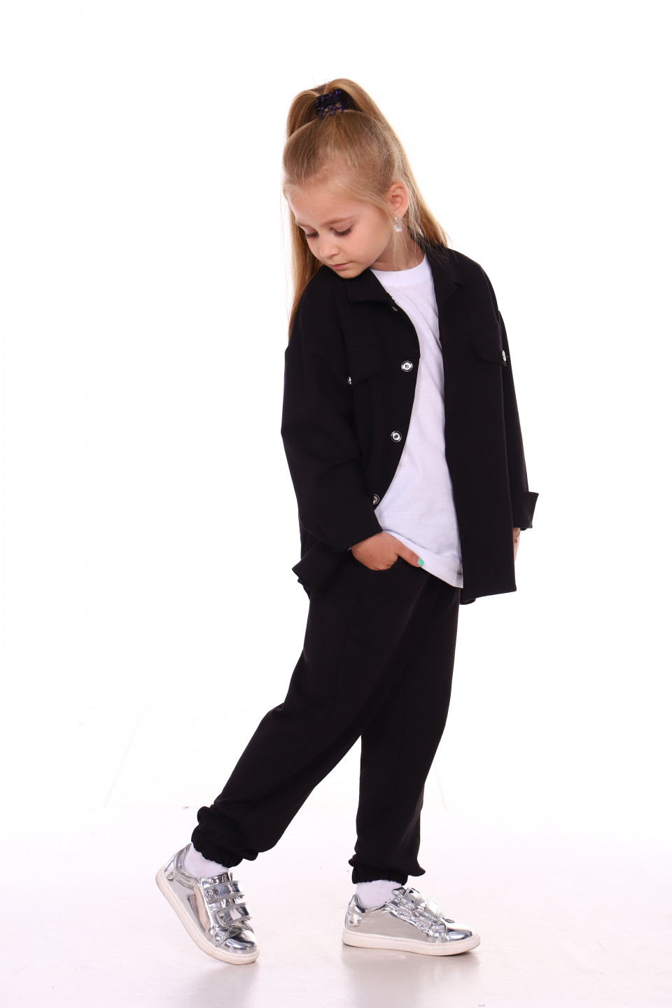Невероятно стильный и модный костюм для детей на осень-весну. Брюки прямого кроя, низ на резинке, по бокам два кармана. Рубашка на пуговицах со спущенным плечом, рукав с манжетой. На полочке отрезная линия, два кармана-обманки.