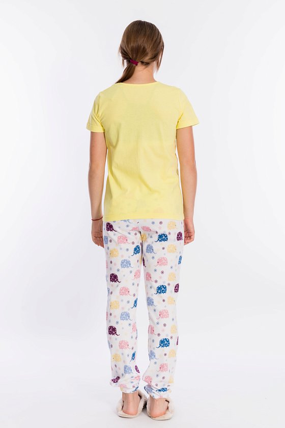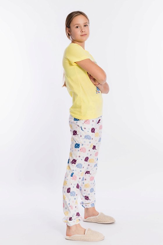 Костюм выполнен из хлопкового полотна, состоит из футболки и брюк. Футболка однотонная, с коротким рукавом, горловина с круглым вырезом обработана бейкой. Спереди расположен принт. Брюки из полотна с набивным рисунком, с боковыми карманами. Пояс и низ брюк на резинке.