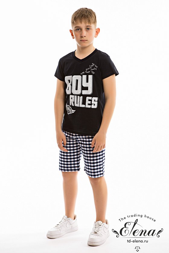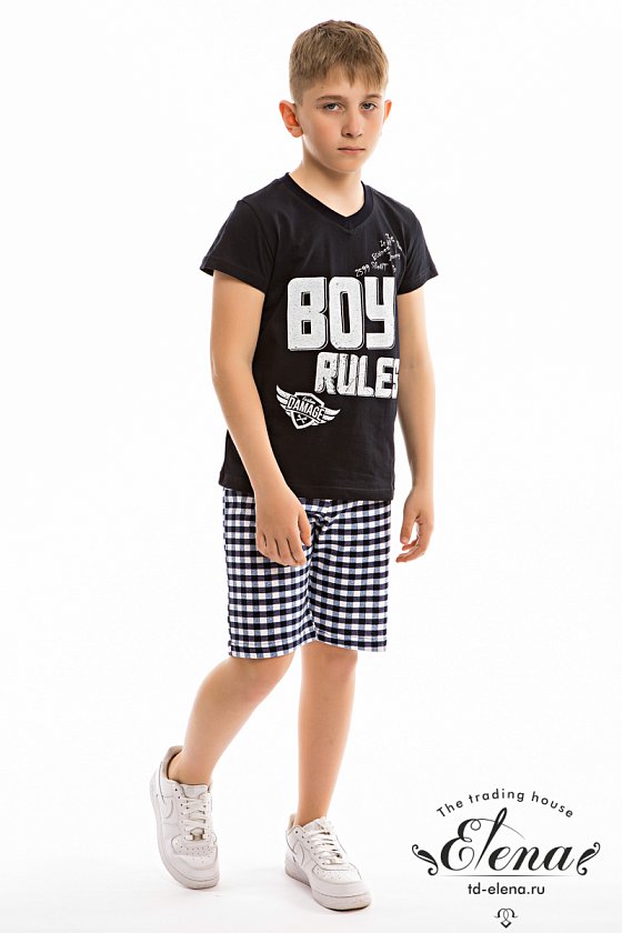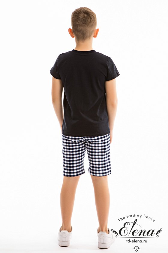 Костюм для мальчика состоит из футболки и шорт. Футболка однотонная, с коротким рукавом и V-образным вырезом горловины. Спереди расположен оригинальный принт. Шорты средней длины из ткани в клетку. Покрой свободный, пояс на резинке.
