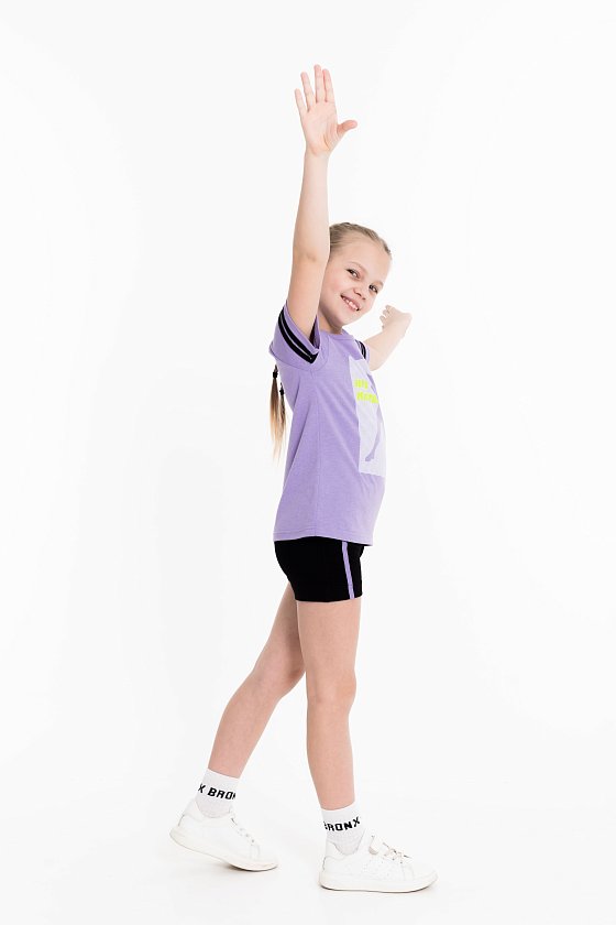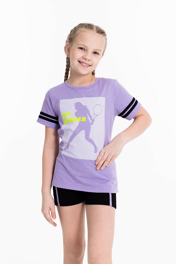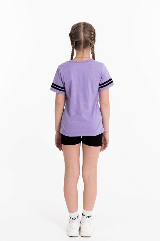 Костюм выполнен из кулирки, 100% хлопок. Футболка с коротким рукавом и круглым вырезом горловины, обработанным бейкой. На рукавах настрочены лампасы. Спереди нанесён принт. Шорты с поясом на резине и лампасами по бокам.