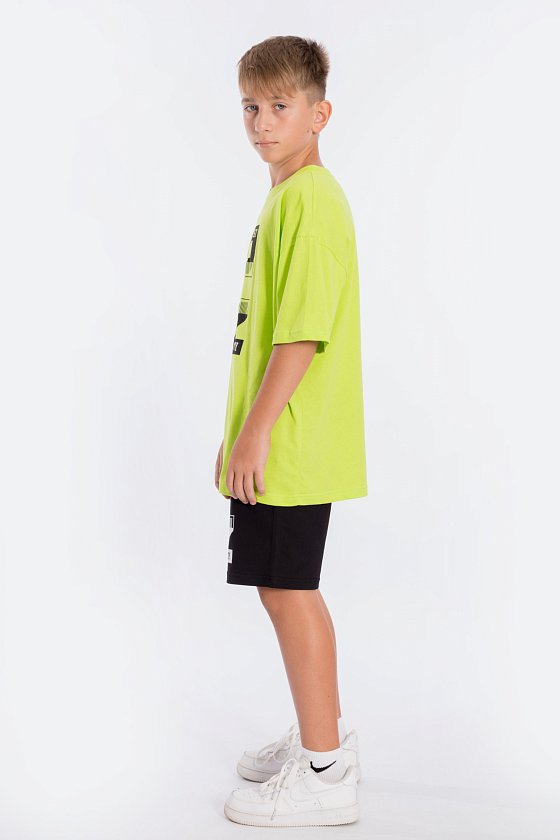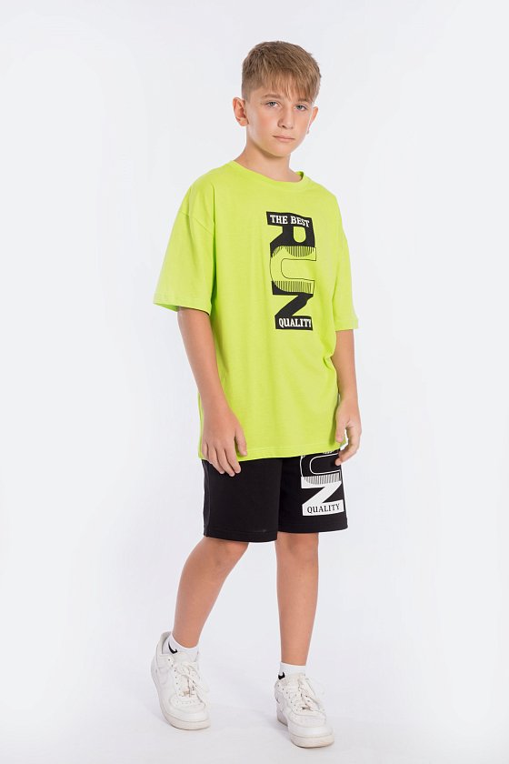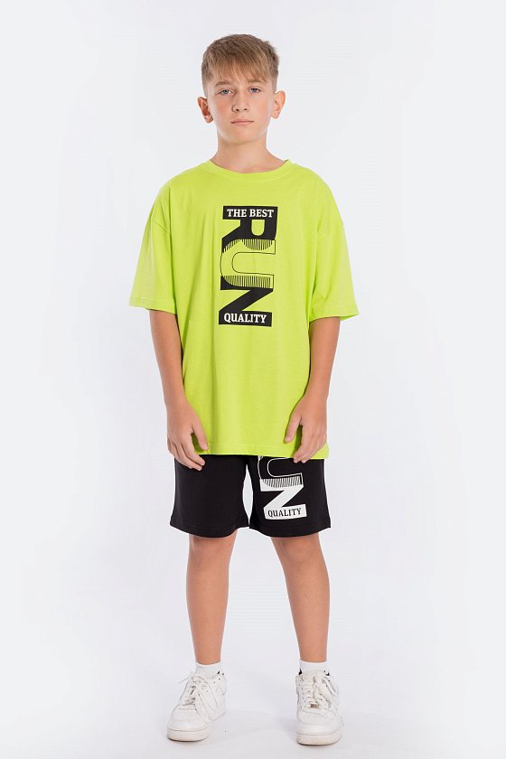 Костюм выполнен из кулирки, состоит из футболки и шорт. Футболка свободного силуэта, со спущенной линией плеча. Спереди нанесён принт. Шорты слегка расширены, с поясом на резине, принтом и карманами по бокам.
