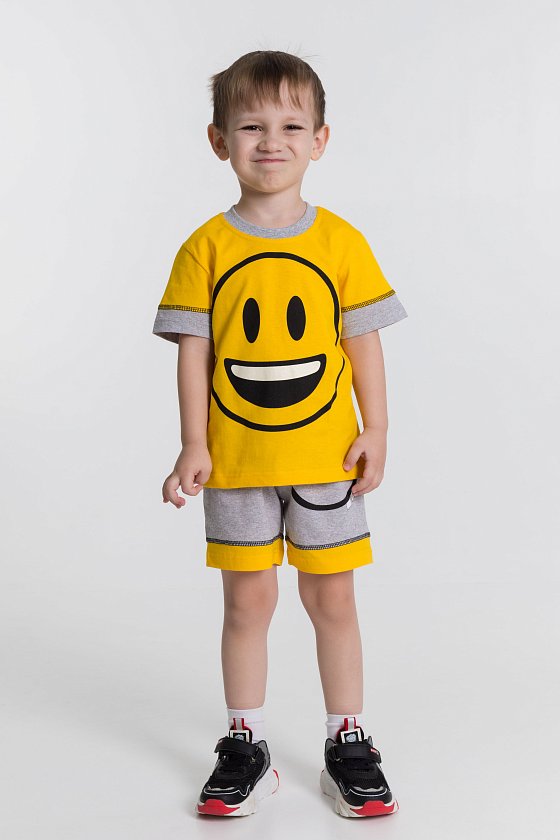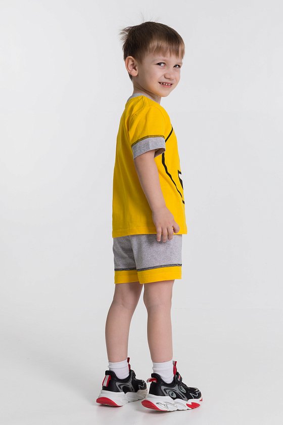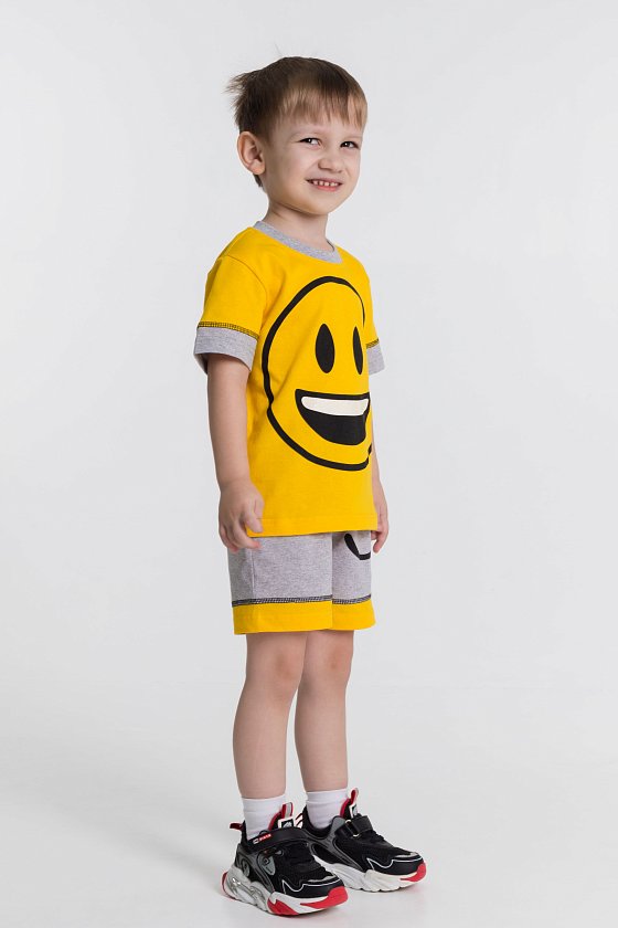 Костюм летний выполнен из кулирки, 100% хлопок. Футболка с коротким рукавом и круглым вырезом горловины. Шорты с поясом на резине. На футболке и шортах нанесён принт.