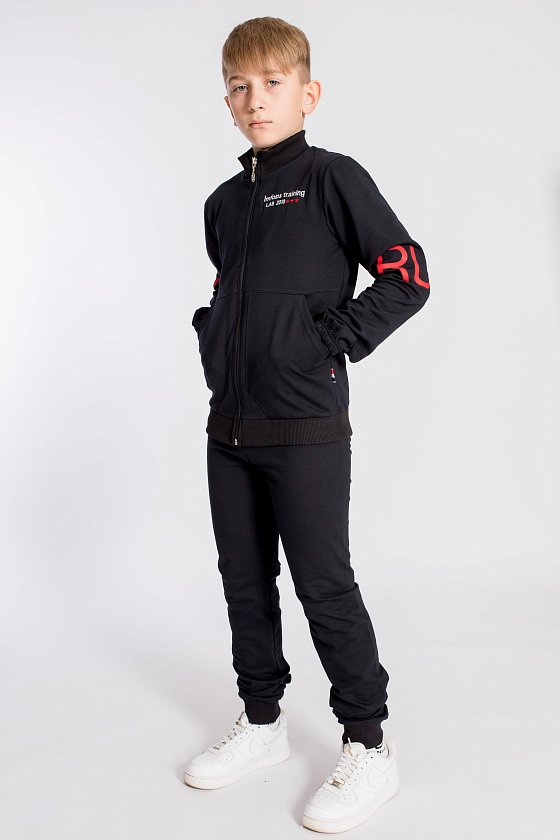 Костюм детский из футер петли, куртка с центральной застежкой на молнию и воротником-стойкой. По бокам расположены карманы. Брюки с поясом на резинке и манжетами. В качестве отделки на рукавах нанесена термопечать, а спереди сделана вышивка.