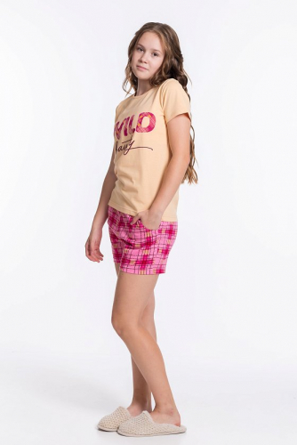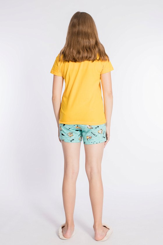 Костюм выполнен из х/б полотна, состоит из футболки и шорт. Футболка с круглым вырезом горловины, обработанным бейкой. Спереди нанесён принт. Шорты с поясом на резине, по бокам расположены карманы.