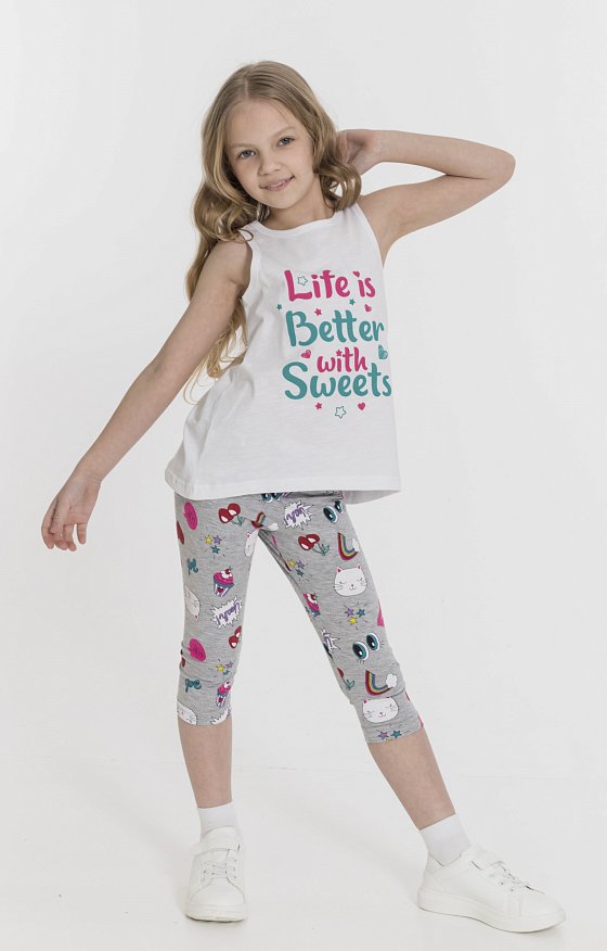 Костюм для девочек выполнен из двух видов полотна - майка из кулирки фламли, а капри из х/б полотна с содержанием лайкры. Майка с круглым вырезом горловины и принтом спереди, низ разноуровневый. Капри с поясом на резине.