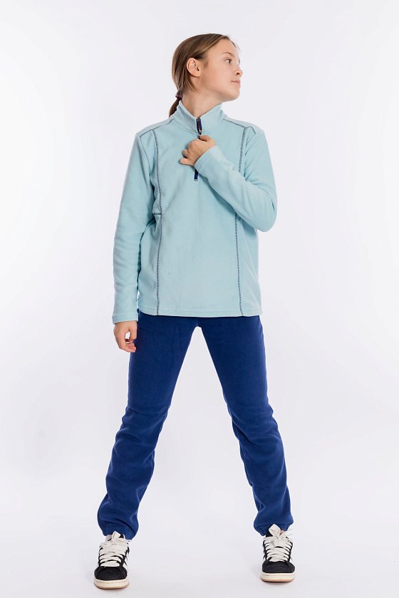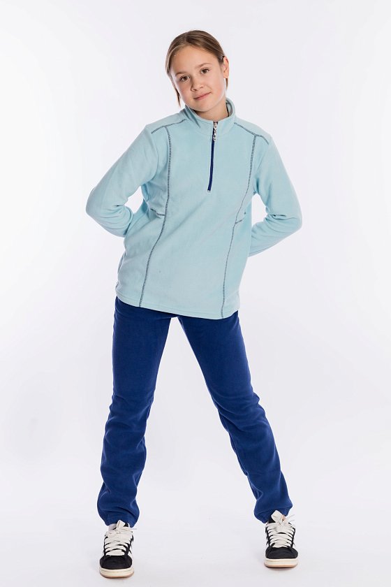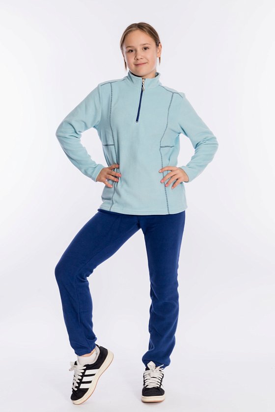 Костюм выполнен из флиса. Толстовка с воротником-стойкой с застёжкой на короткую молнию. Пояс и низ брюк на резинке. На толстовке и брюках в качестве отделки декоративная отстрочка.