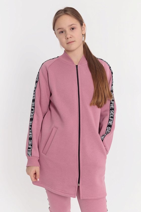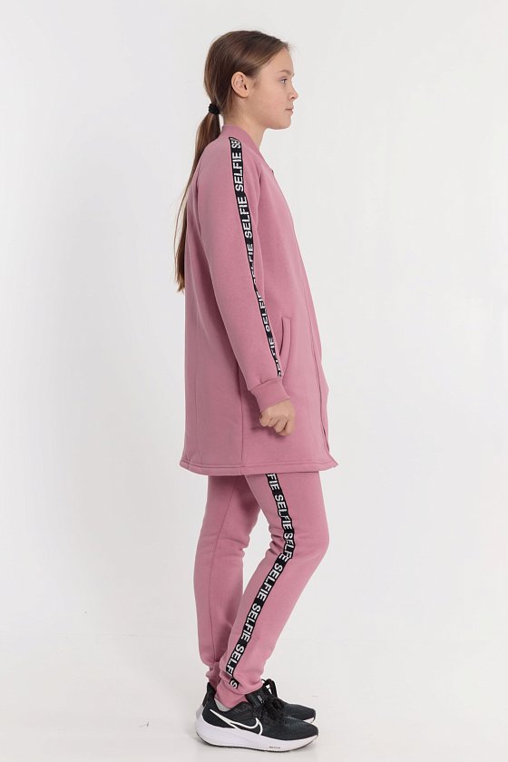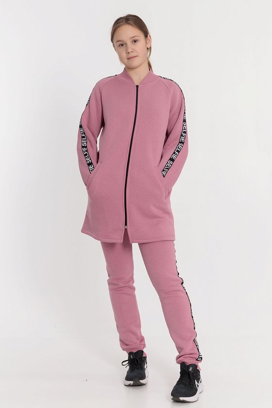 Костюм выполнен из полотна с начёсом, состоит из кардигана и брюк. Кардиган с центральной застёжкой на молнию, по бокам размещены прорезные карманы. По линии швов рукавов реглан, а также вдоль боковых швов брюк настрочена киперная тесьма. Брюки с поясом на резине, по бокам расположены карманы.