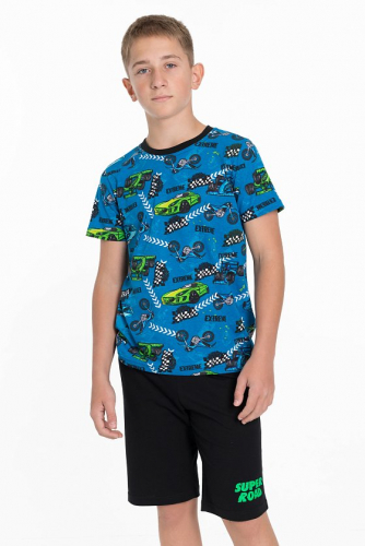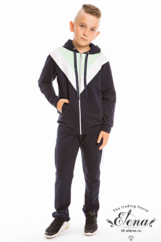 Костюм выполнен из футер петли с лайкрой, состоит из толстовки с капюшоном и застёжкой на молнию и зауженных брюк. На толстовке и брюках есть карманы и вставки из отделочного полотна.
