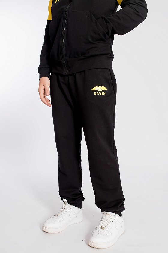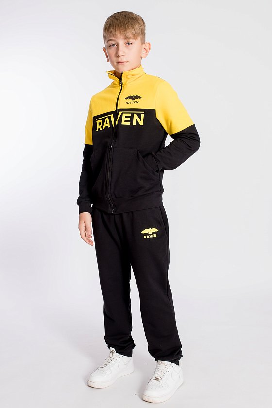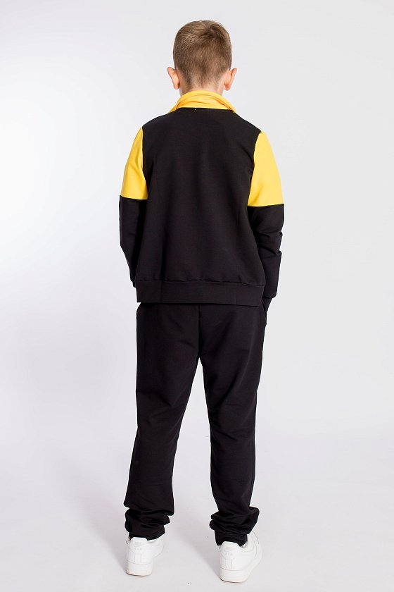 Костюм выполнен из однотонного футера с лайкрой, состоит из брюк и толстовки. Толстовка с застежкой на молнию, воротником-стойкой и карманами-кенгуру. Рукава на манжетах, кокетки переда и верхние детали рукавов из полотна отделочного цвета. На толстовке и брюках нанесён принт. Брюки с боковыми карманами, притачным поясом и манжетами.