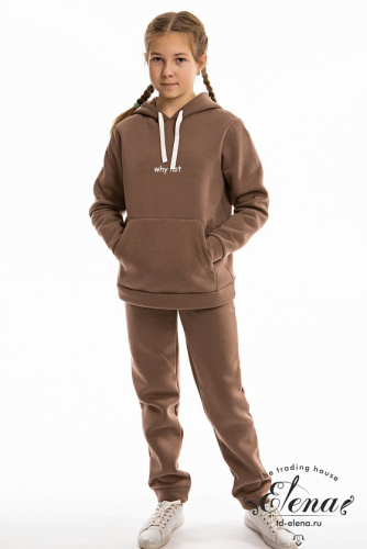Костюм выполнен из футер петли с лайкрой. Толстовка с капюшоном и застёжкой на молнии, ширина капюшона регулируется при помощи шнура. На толстовке по бокам размещены карманы, пояс и манжеты на рукавах и брюках из кашкорсе. На толстовке и брюках нанесён принт.