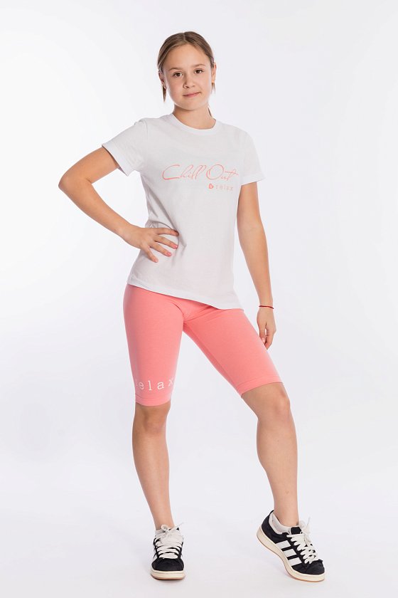 Летний костюм выполнен из хлопкового полотна. Футболка с ассиметричным низом и принтом спереди из кулирки. Велосипедки выполнены из кулирки с лайкрой, пояс на резине. На футболке и велосипедках нанесён принт.