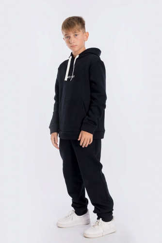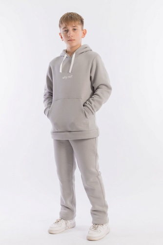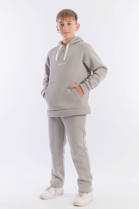 Костюм выполнен из футера с начёсом (трёхнитка), состоит из толстовки и брюк. Толстовка с капюшоном, карманом-кенгуру и принтом спереди. Пояс толстовки, низ рукавов и низ брюк оформлены манжетами из основного полотна. Пояс брюк на резине и шнуре.