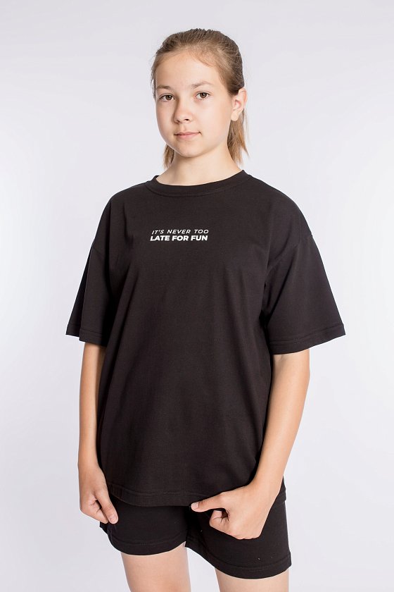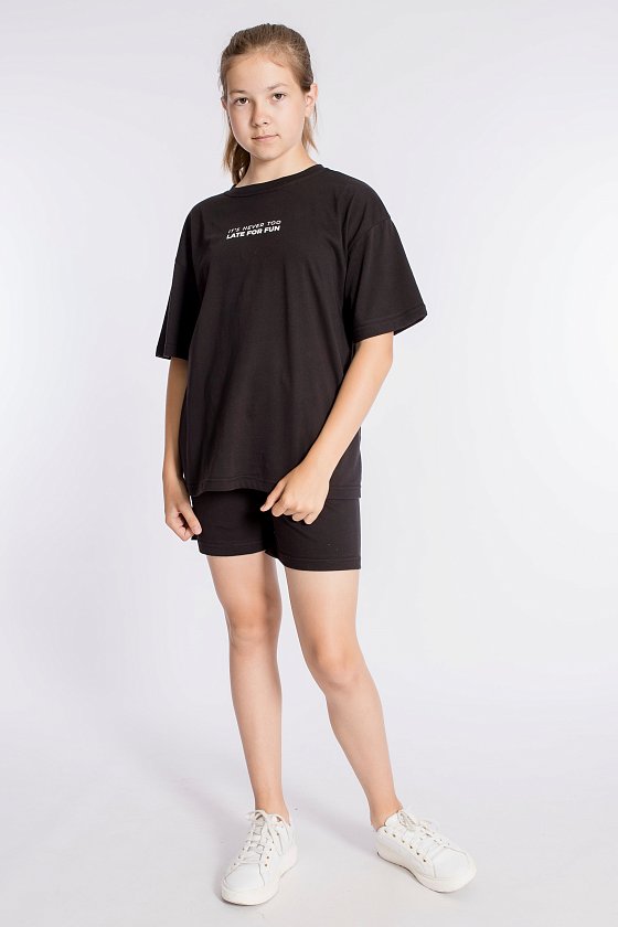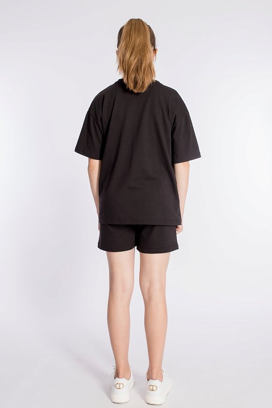 Футболка имеет короткий втачной рукав и украшена принтом спереди. Шорты слегка расширены, есть боковые карманы и притачной пояс на резинке. Костюм выполнен в однотонном черном цвете, что позволяет сочетать его с различными элементами гардероба.