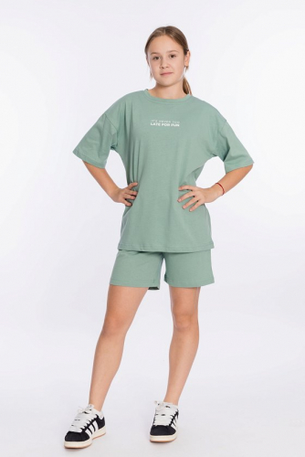 Модный костюм для девочки выполнен из мягкой и приятной к телу ткани — кулирки (100% хлопок). Он состоит из свободных шорт и футболки, что обеспечивает комфорт и свободу движений.