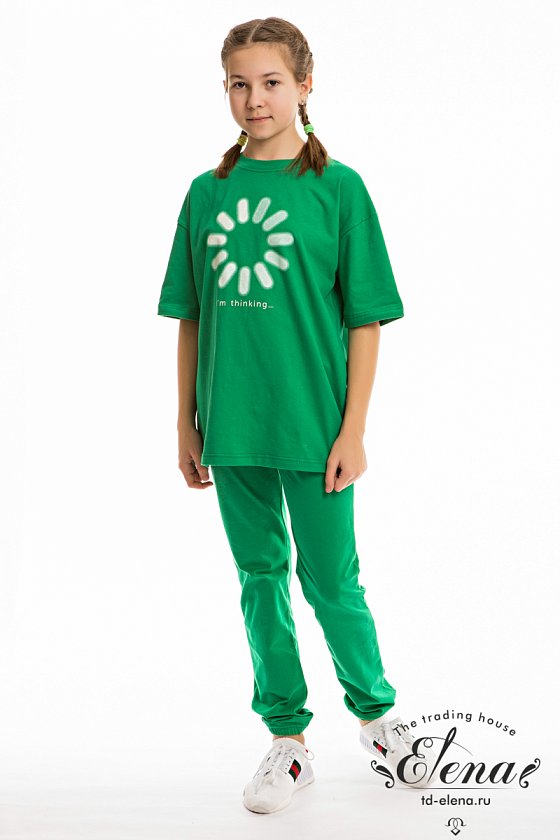 Костюм выполнен из кулирки с добавлением лайкры, состоит из футболки и брюк. Футболка свободного силуэта, со спущенной линией плеча. Спереди нанесён принт, светящийся в темноте. Пояс брюк и манжеты внизу на резине.